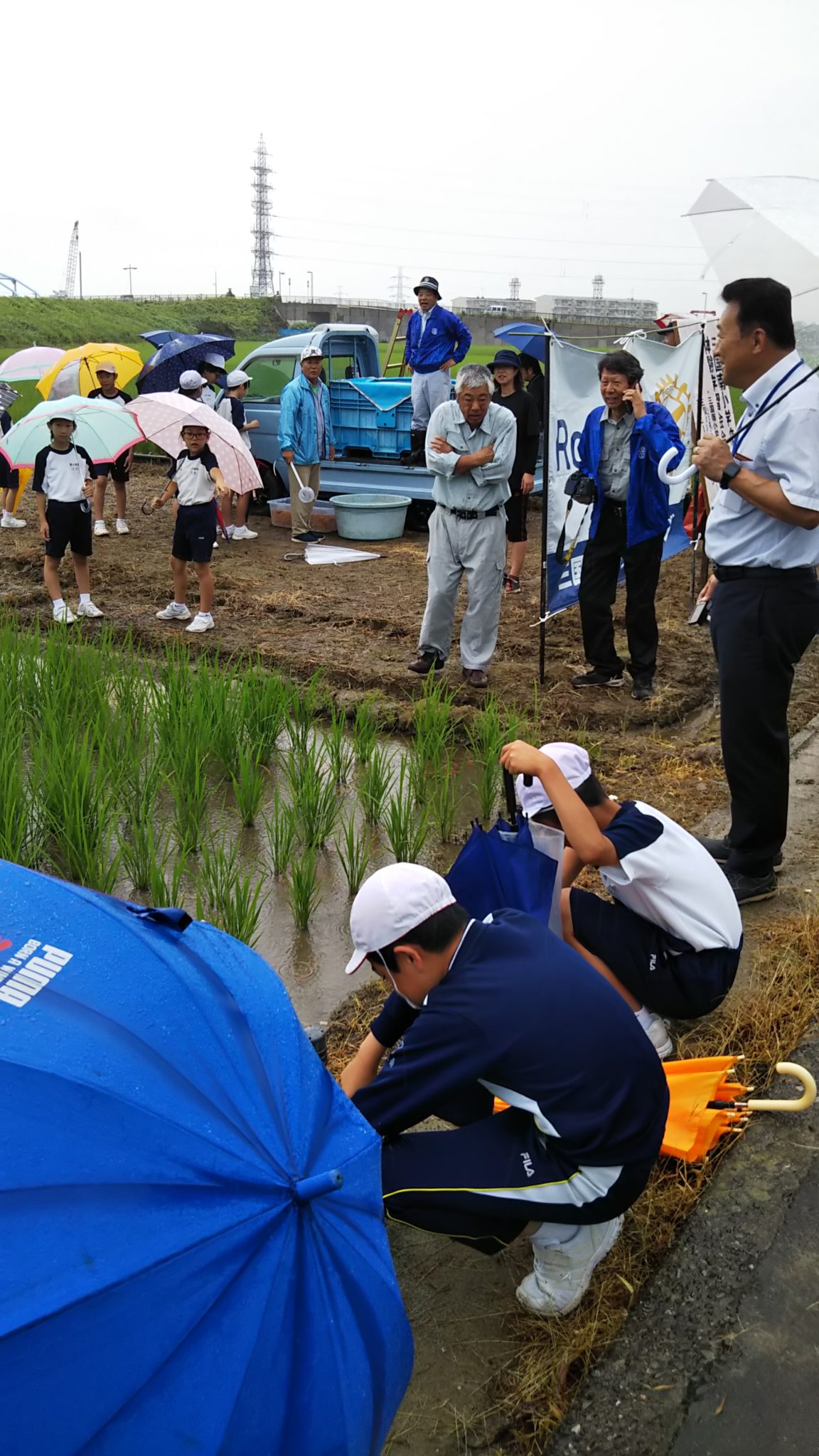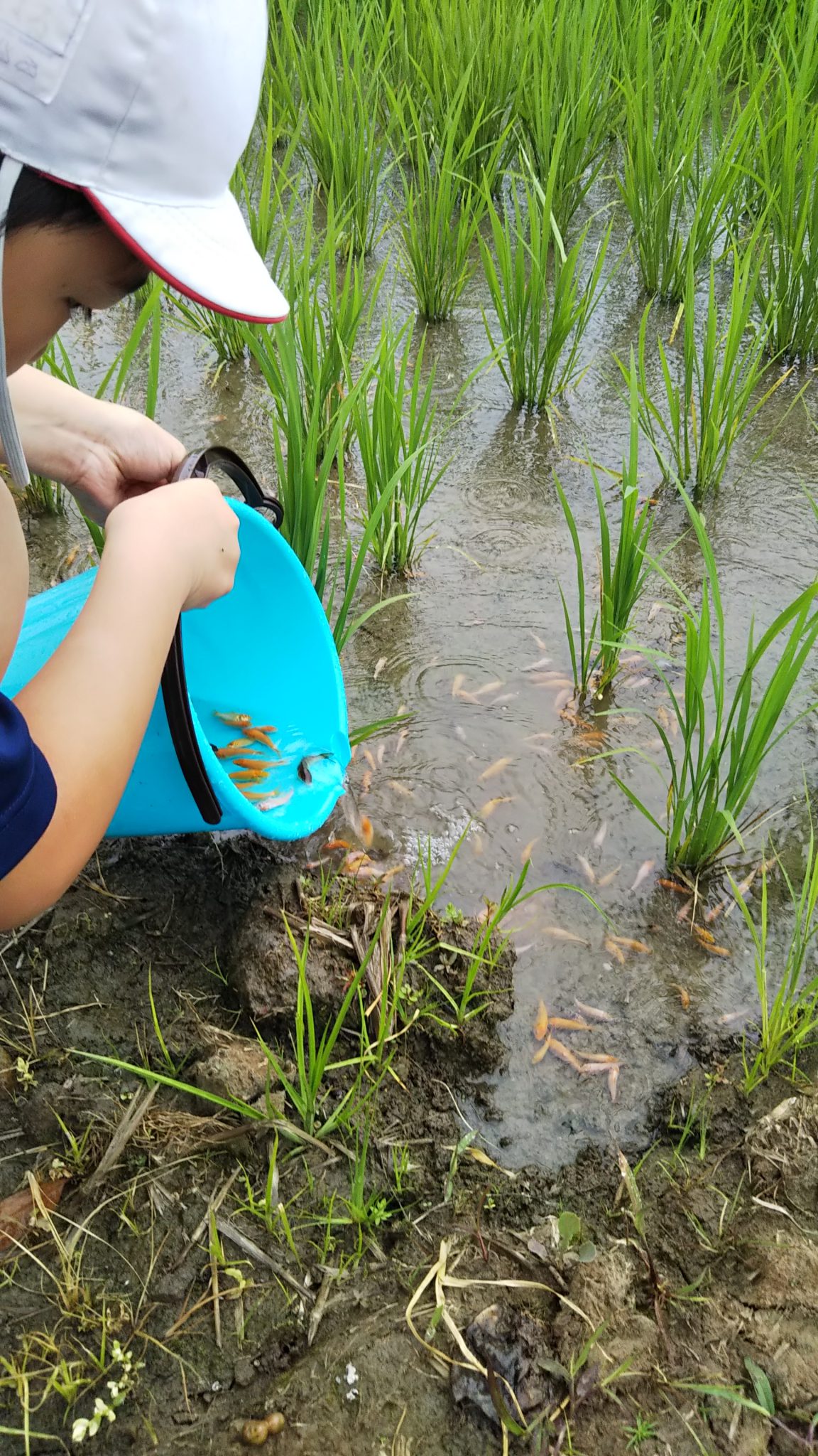 梅雨空の中、5月に田植えを行った学校田に害虫駆除の目的で鯉の稚魚を放流しました。
