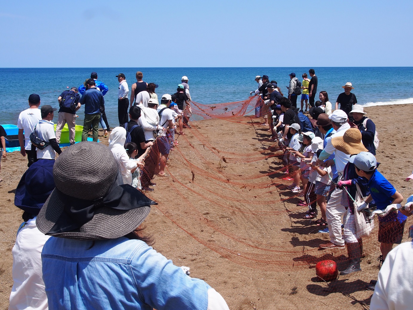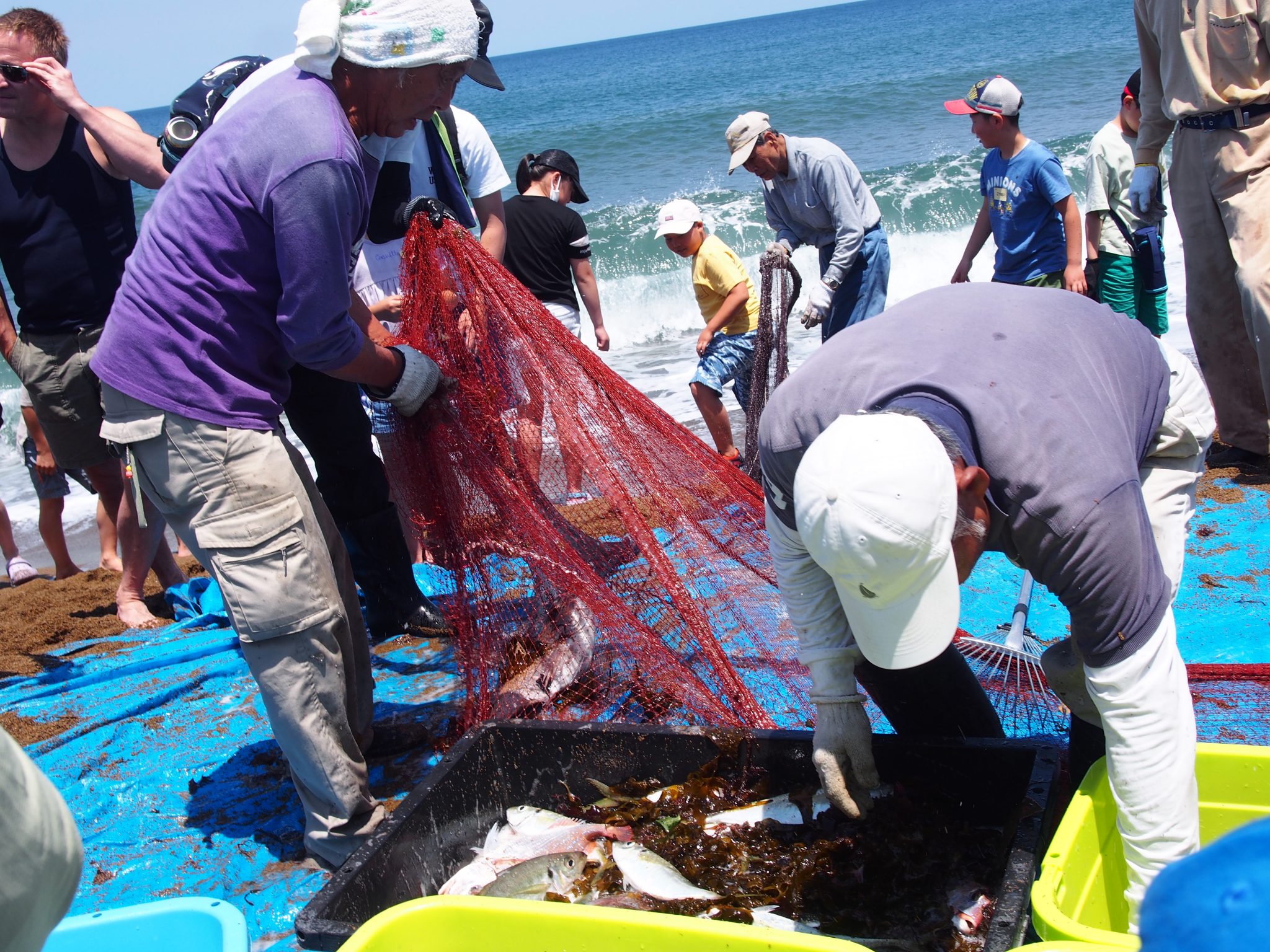 前々日の大雨で地引網ができるか危ぶまれましたが、当日は快晴でたくさんの人に参加して頂きました。