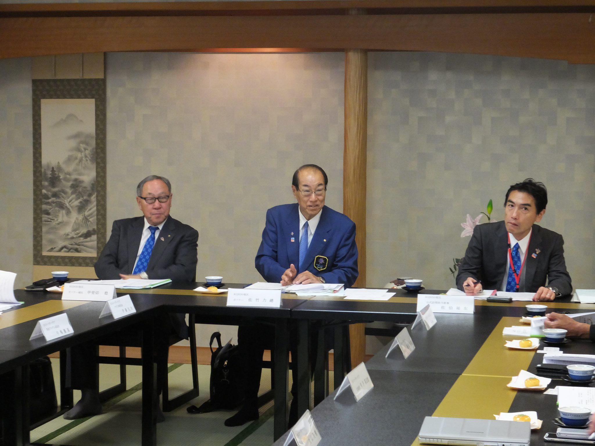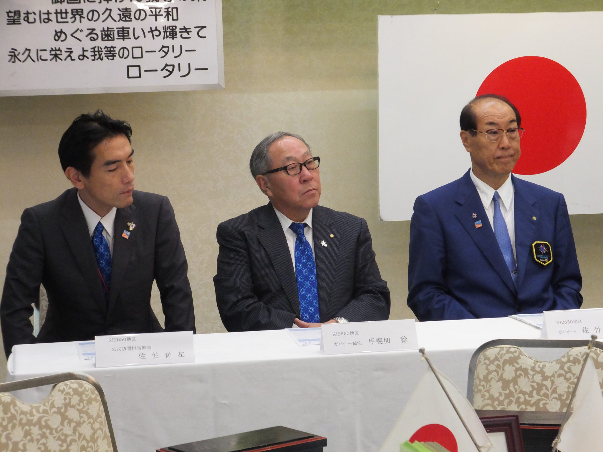 佐竹力總ガバナー、甲斐切稔ガバナー補佐、佐伯祐左公式訪問担当幹事の3名をお迎えし、午前中は両クラブ別々に懇談会を行い、12時30分から合同で例会が開催されました。