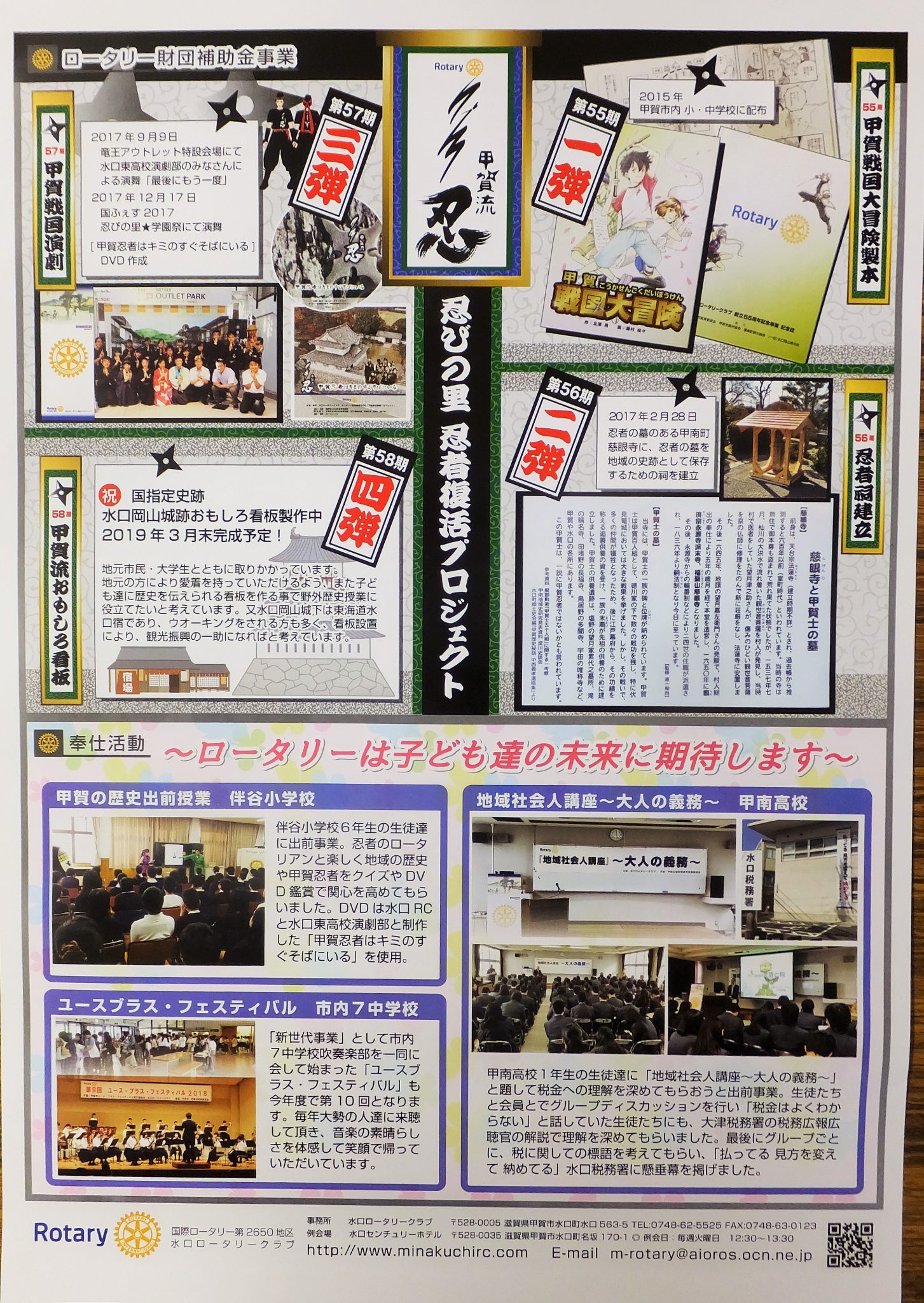 活動報告ACTIVITES REPORTS 活動レポート作成 2018.12.25 毎年1月1日の新聞に「活動レポート」のチラシを折り込みしています。 甲賀市内約30,000戸に配布します。 水口ロータリークラブの活動や、会員の紹介がひろく広報できることを願っています。