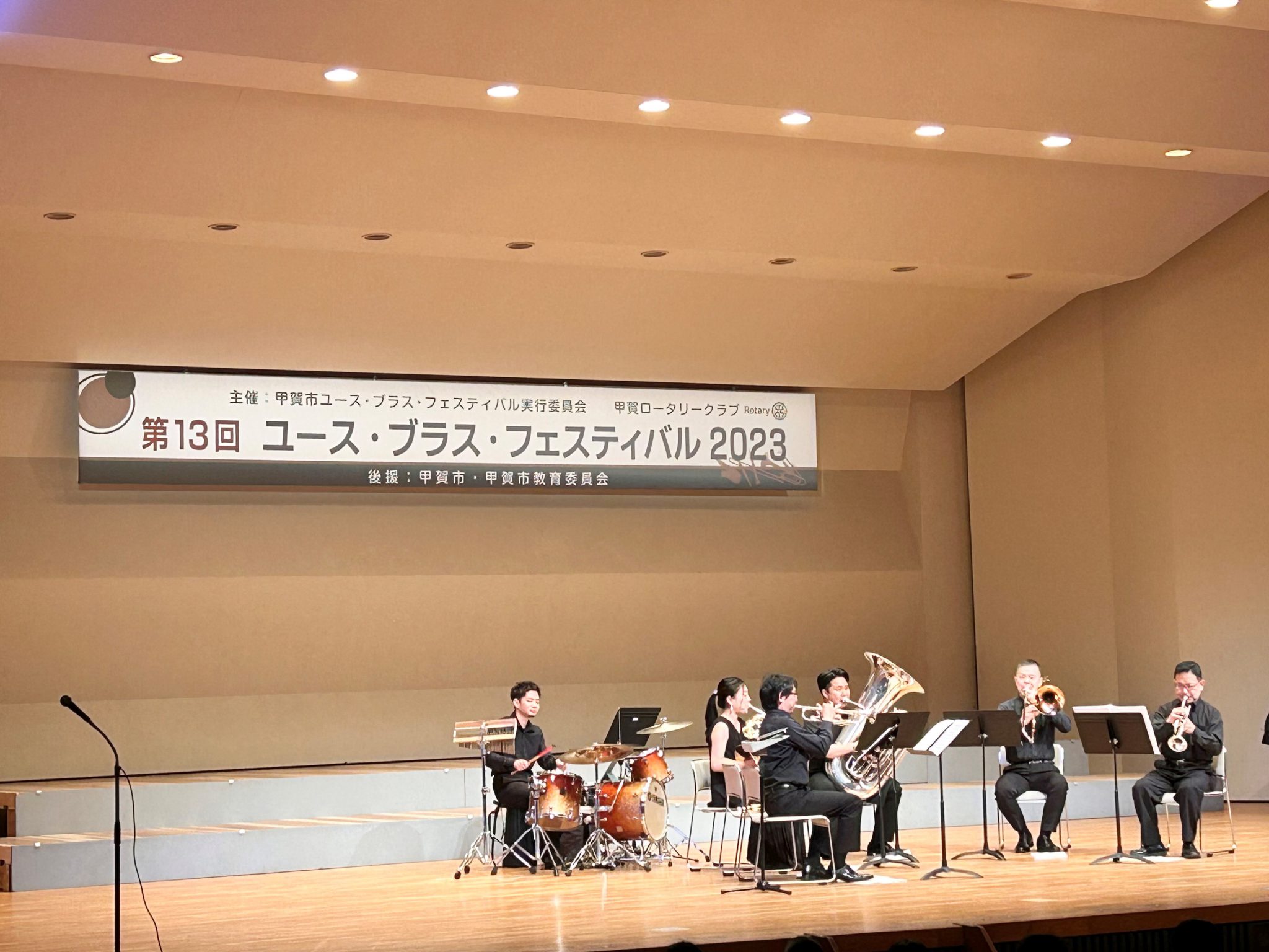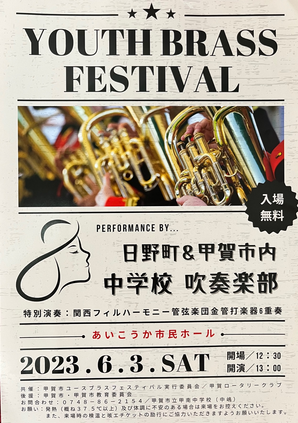 前日までの大雨が嘘のように晴れ渡った6月3日(土)、第13回ユースブラスフェスティバルがあいこうか市民ホールで開催されました。「ユースブラスフェスティバル」は、甲賀(水口)ロータリークラブが2010年に計画・スタートした青少年奉仕事業です。立ち見が出るほどの多くのお客様が見守る中、日野町と甲賀市内7つの中学校の吹奏楽部の皆さんが素晴らしい演奏を披露されました。また特別演奏として「関西フィルハーモニー管弦楽団」をお招きし「金管・打楽器6重奏」を演奏していただき、プロによる素晴らしい生演奏の音色が響き渡りました。