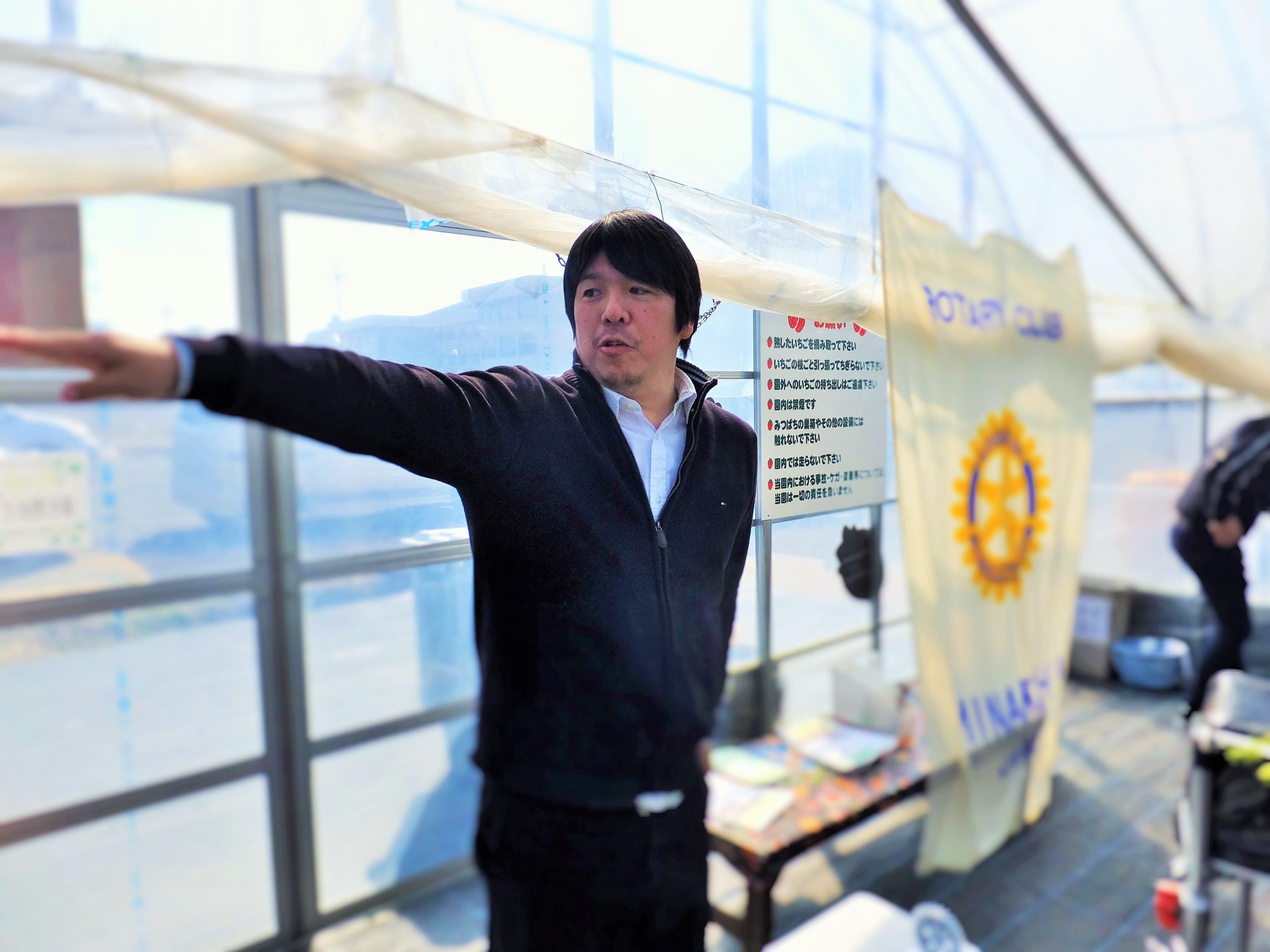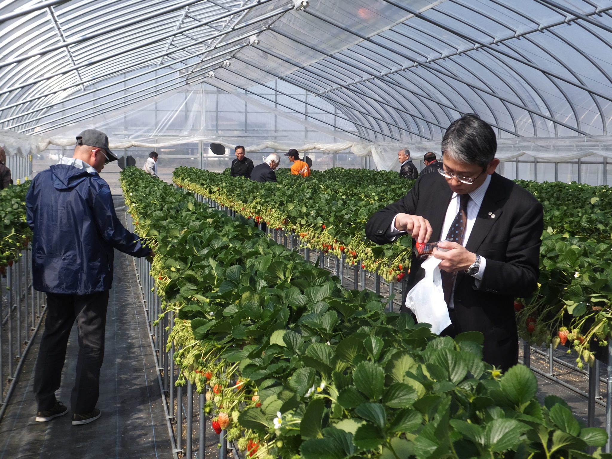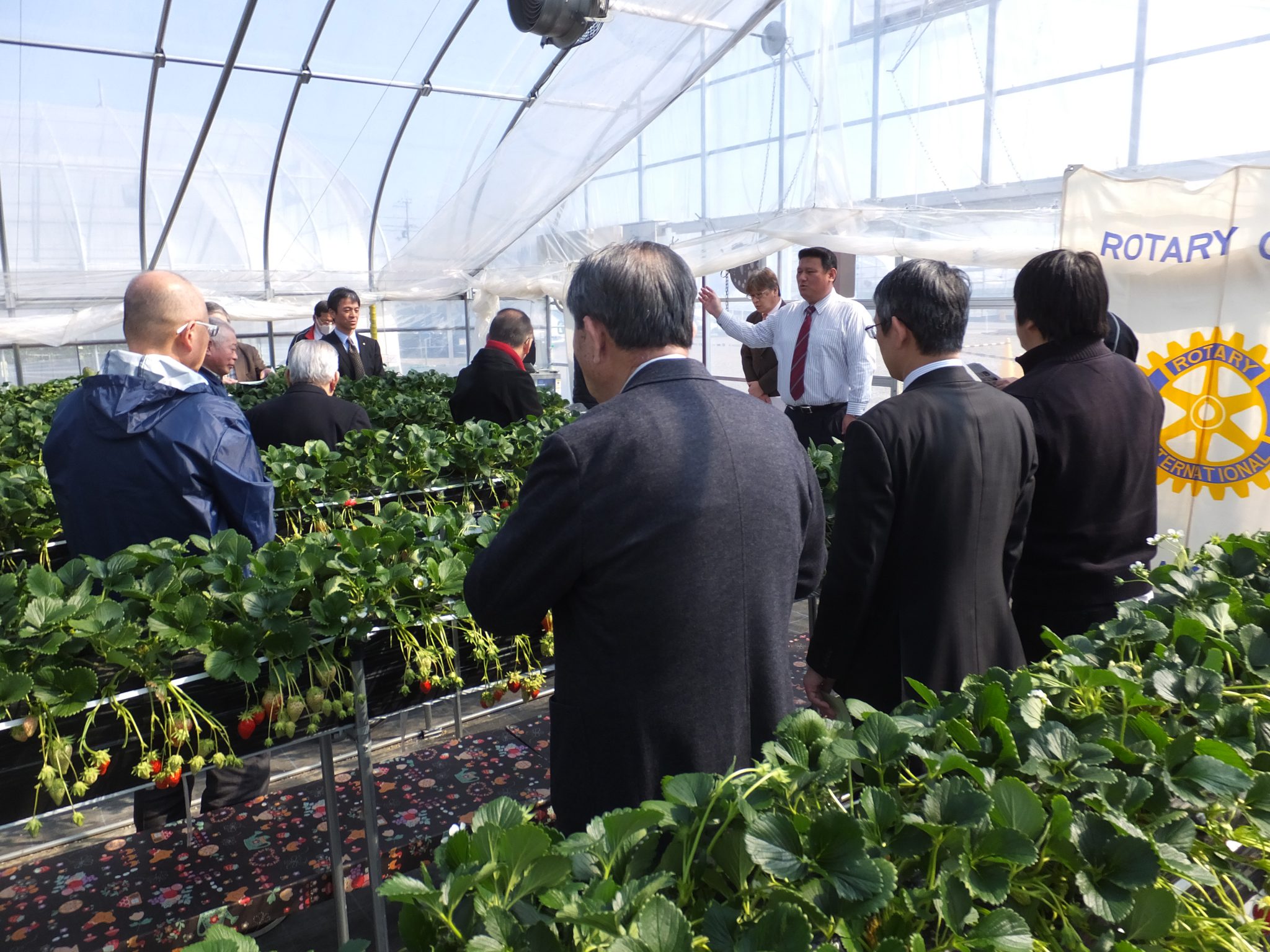 平成30年2月27日(火)晴天に恵まれ、職場訪問例会で小山剛会員の「みなくちテクノスファーム 鹿深いちご園」を訪問しました。みなくちテクノスファームは資源循環型社会の実現と、ゴミの減量化、地球温暖化の原因となる二酸化炭素の発生を抑えることを目的とし、生ごみ堆肥を活用した農業をされています。地元で取れた野菜を地元で消費し、家庭やスーパー、ホテルから出た生ごみを分別回収したものを堆肥化しその堆肥で野菜を生産するシステムに取り組んでおられます。小山会員の「観光農園について」と題して卓話を聴き、その後、大きなハウスの中で赤く色づいた甘いいちごをお腹一杯いただきました。