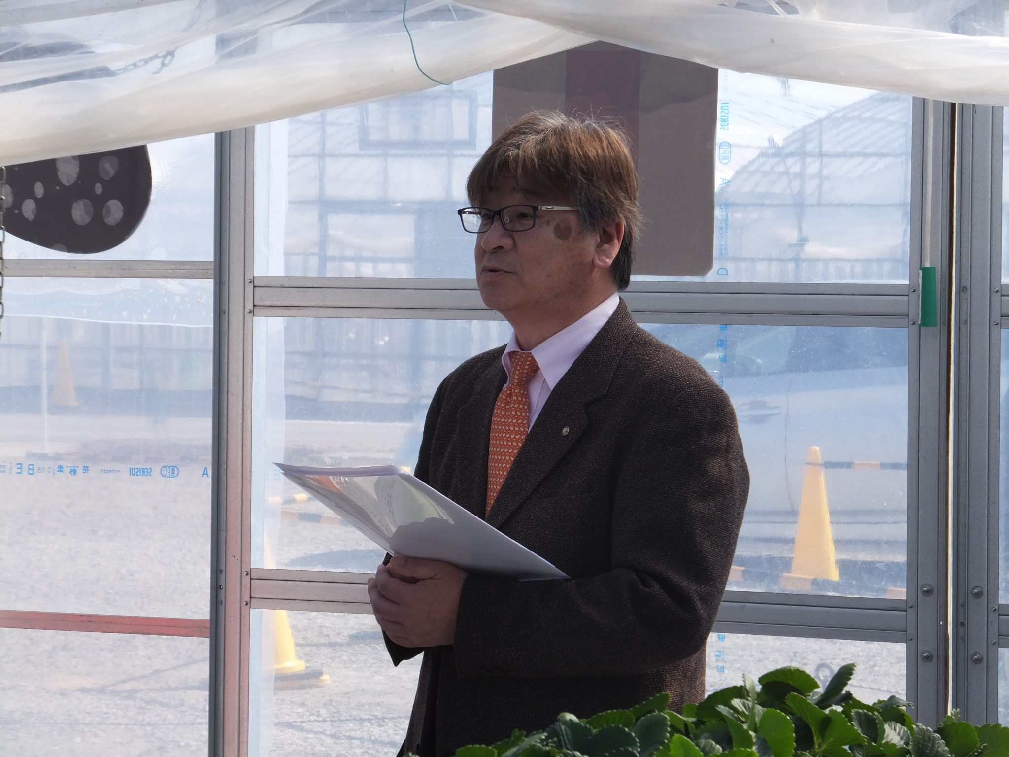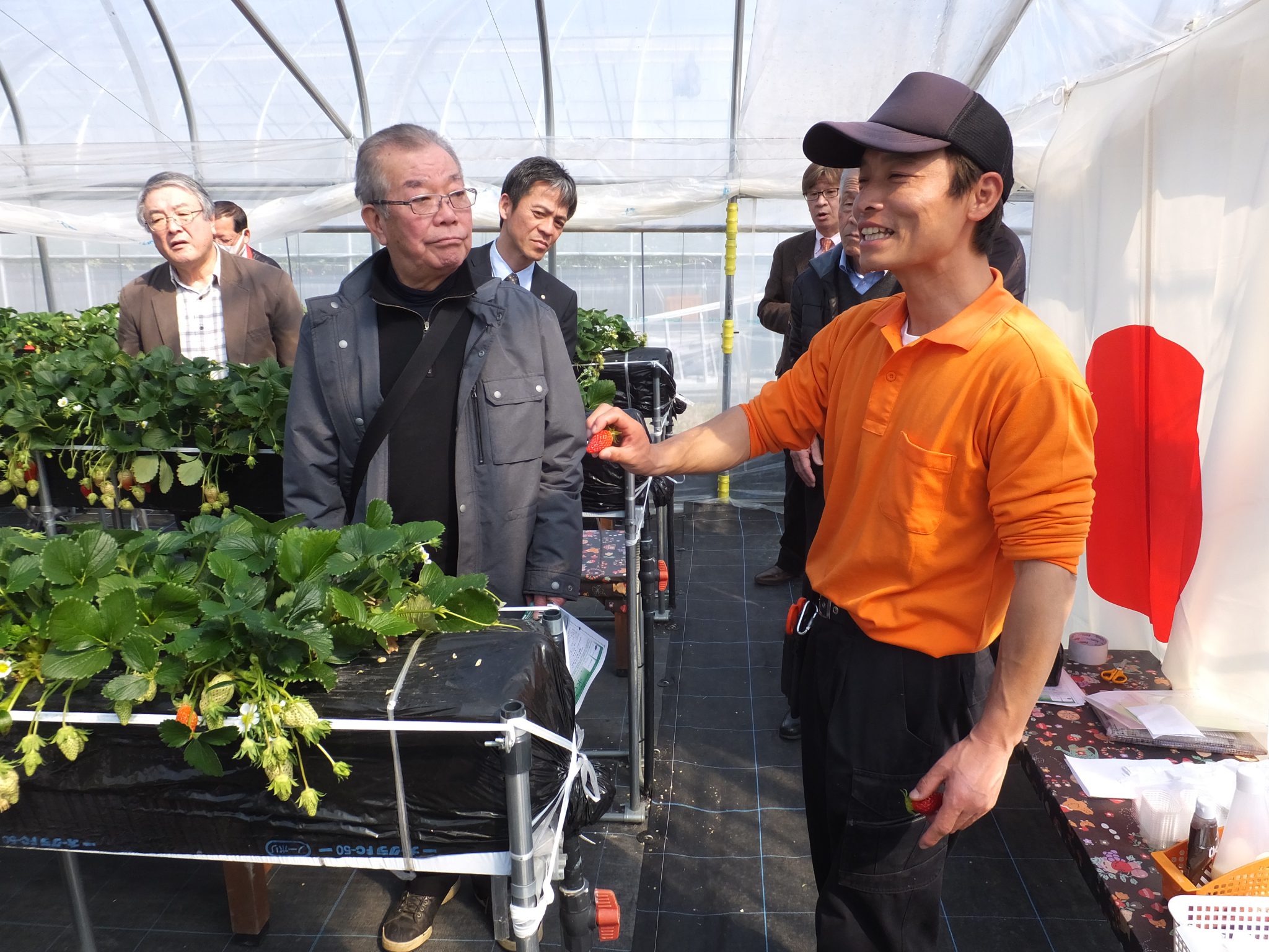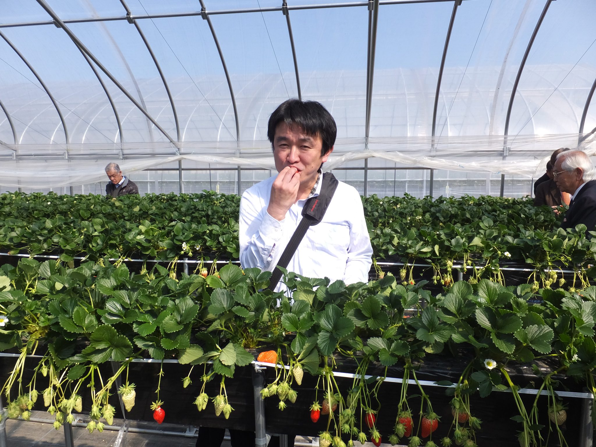 平成30年2月27日(火)晴天に恵まれ、職場訪問例会で小山剛会員の「みなくちテクノスファーム 鹿深いちご園」を訪問しました。みなくちテクノスファームは資源循環型社会の実現と、ゴミの減量化、地球温暖化の原因となる二酸化炭素の発生を抑えることを目的とし、生ごみ堆肥を活用した農業をされています。地元で取れた野菜を地元で消費し、家庭やスーパー、ホテルから出た生ごみを分別回収したものを堆肥化しその堆肥で野菜を生産するシステムに取り組んでおられます。小山会員の「観光農園について」と題して卓話を聴き、その後、大きなハウスの中で赤く色づいた甘いいちごをお腹一杯いただきました。