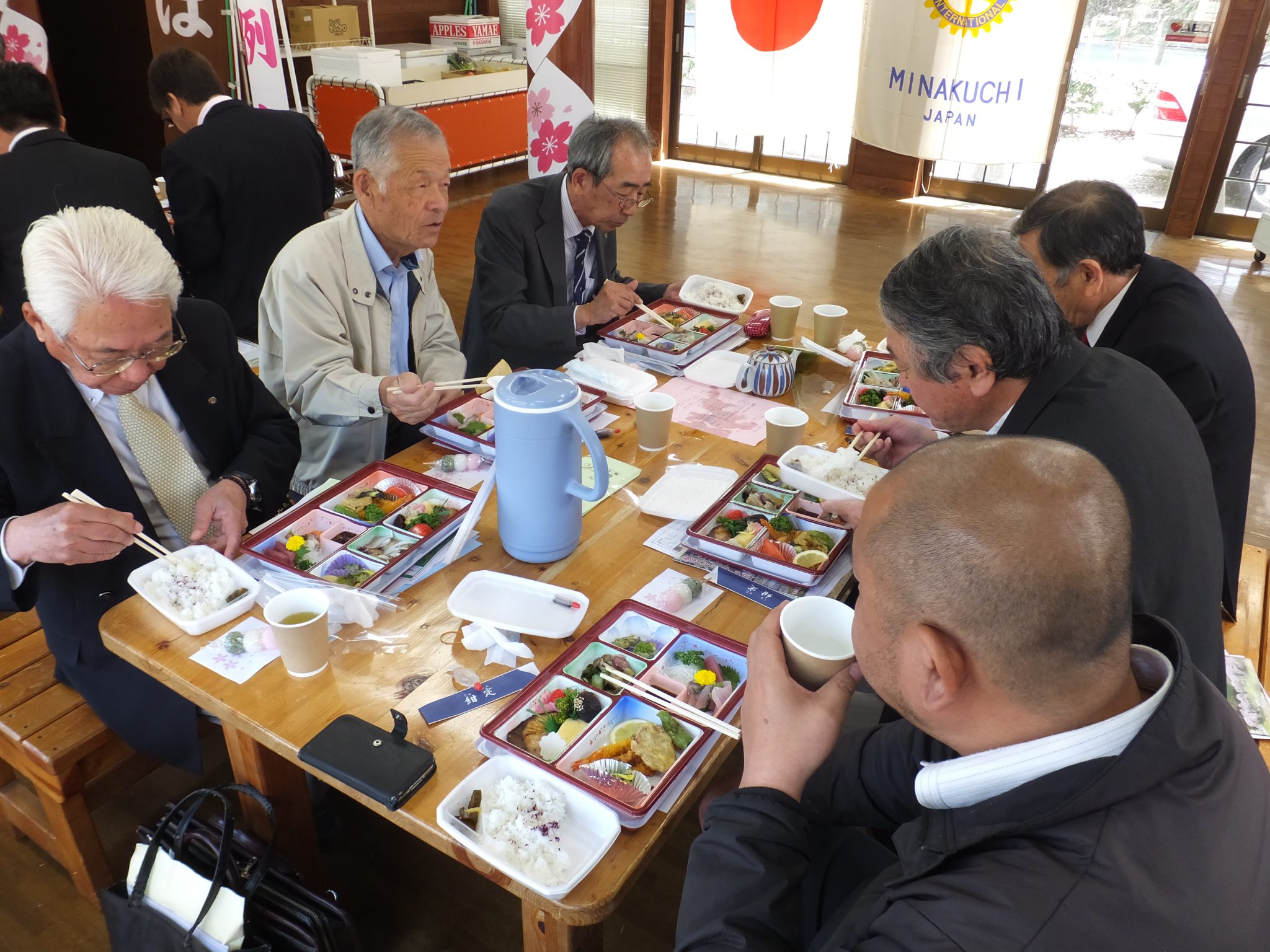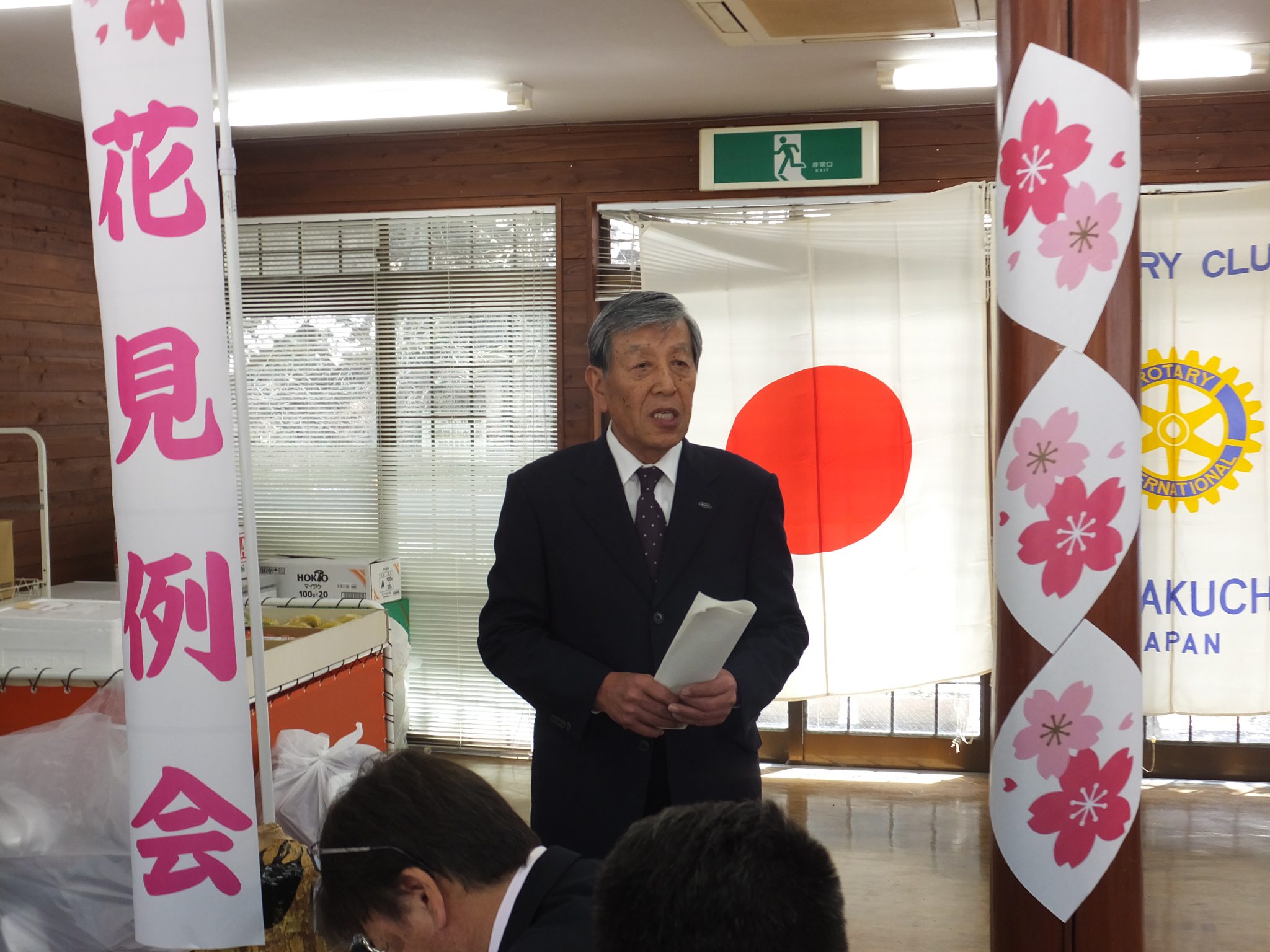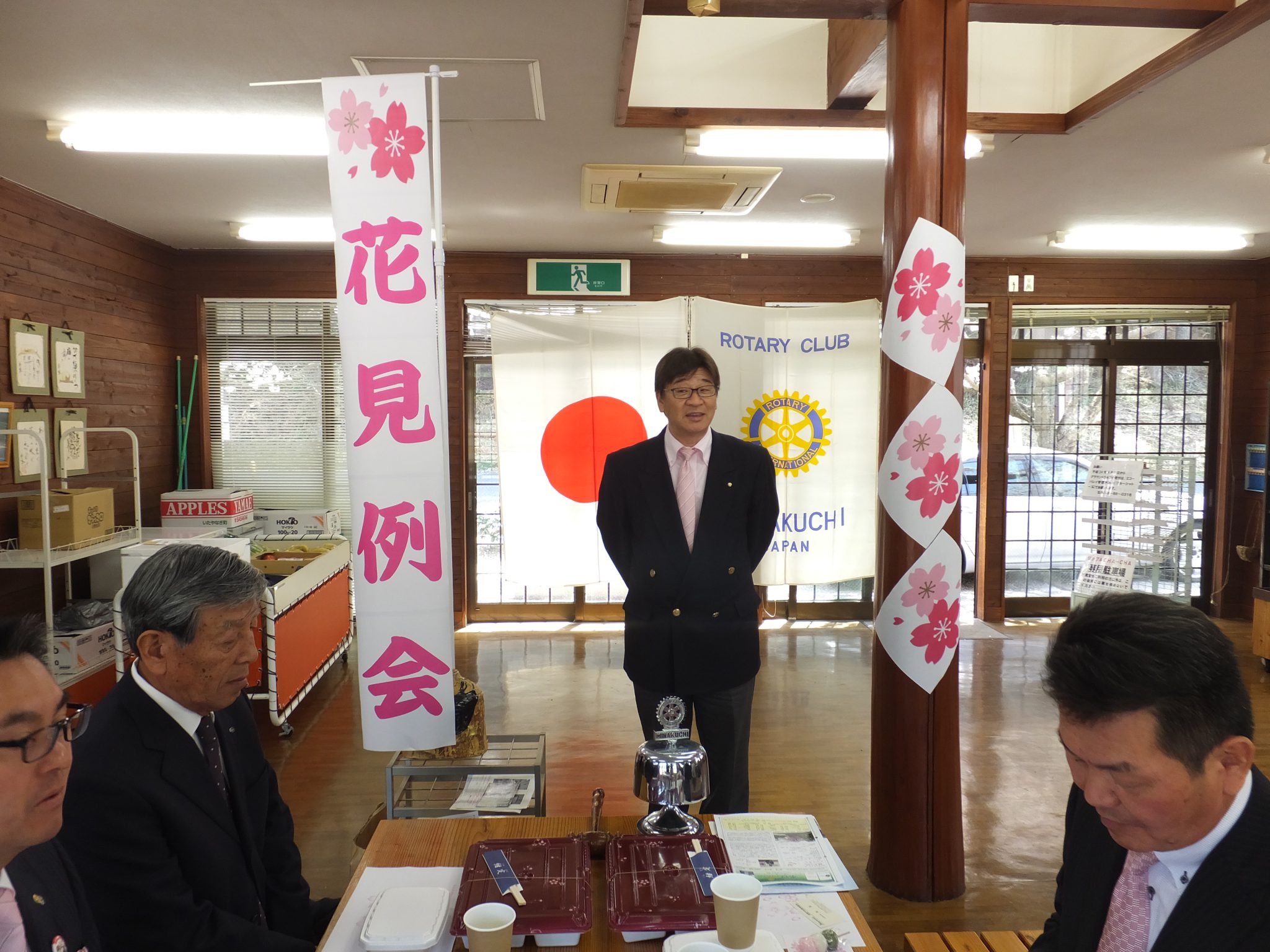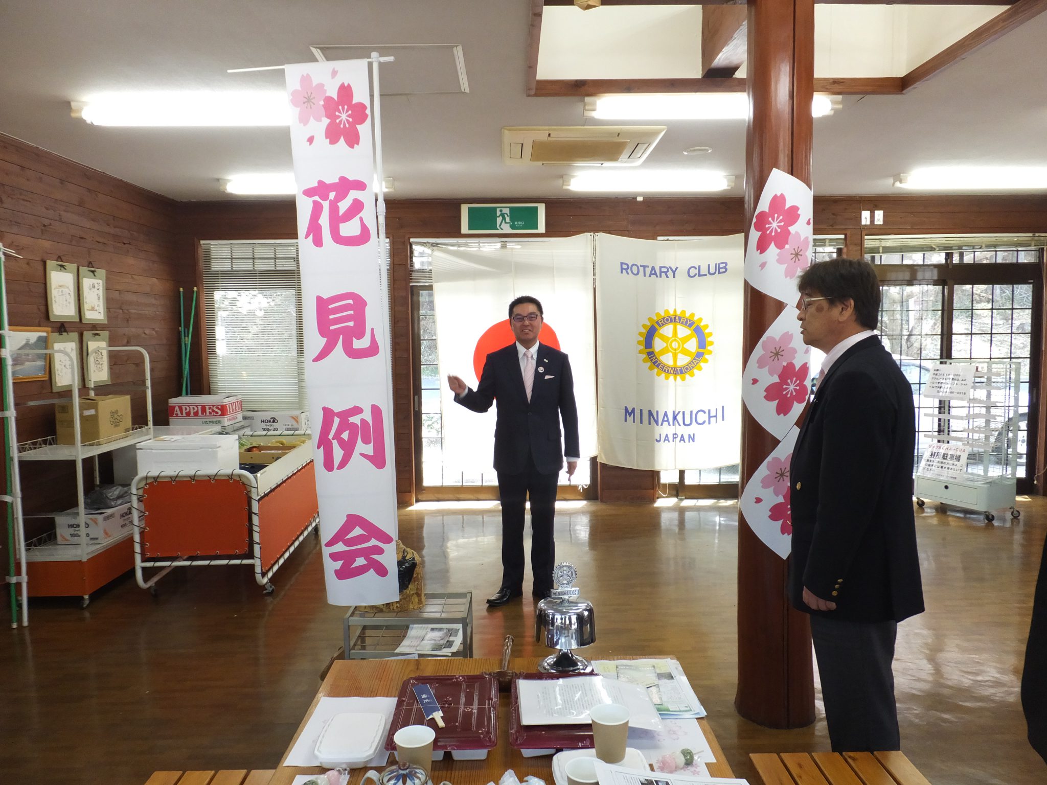 今年の桜は例年より開花が早く、花見例会の頃には桜は見られないかと心配しましたが、甲賀市土山町鮎河の青土ダム周辺、うぐい川周辺の桜は満開でした。例会では滋賀中央森林組合代表理事専務の南清氏に「うぐい川桜の歴史について」と題して卓話を聴きました。ぽかぽか陽気の中、花見弁当、花見だんごで楽しい例会のひと時となりました。これからも地元甲賀市土山の桜の名所を広くPRし、桜の時期に多くの観光客が訪れてくれることを願っています。