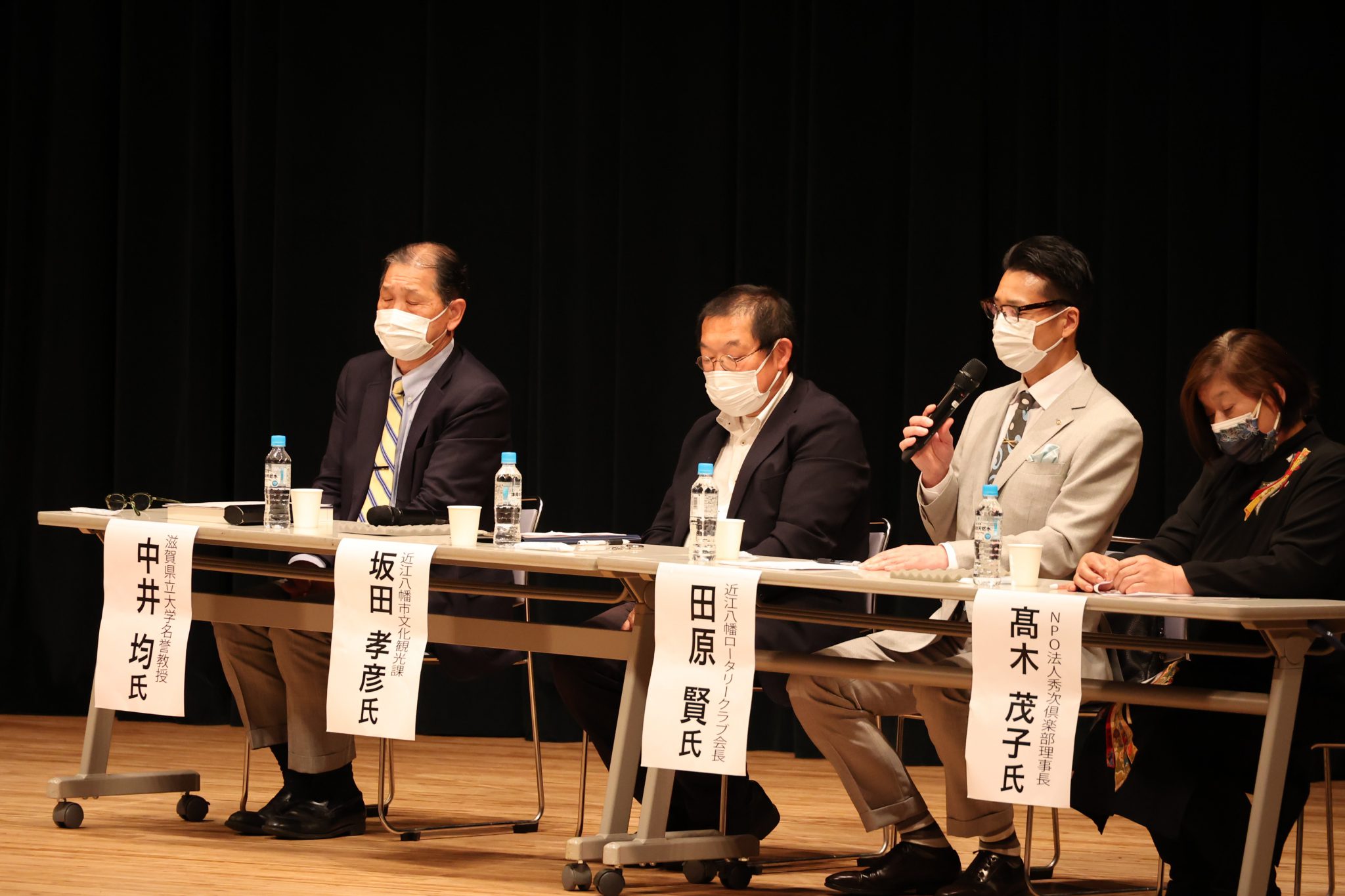 第一部では、中井均氏(滋賀県立大学名誉教授)をお招きして記念講演をしていただき、第二部では「観音寺城・安土城・八幡山城」をテーマに当クラブ会長の田原賢君、松下浩氏(滋賀県文化財保護課)、コーディネーターの井戸洋氏(ジャーナリスト)を交えてのパネルディスカッションを開催しました。