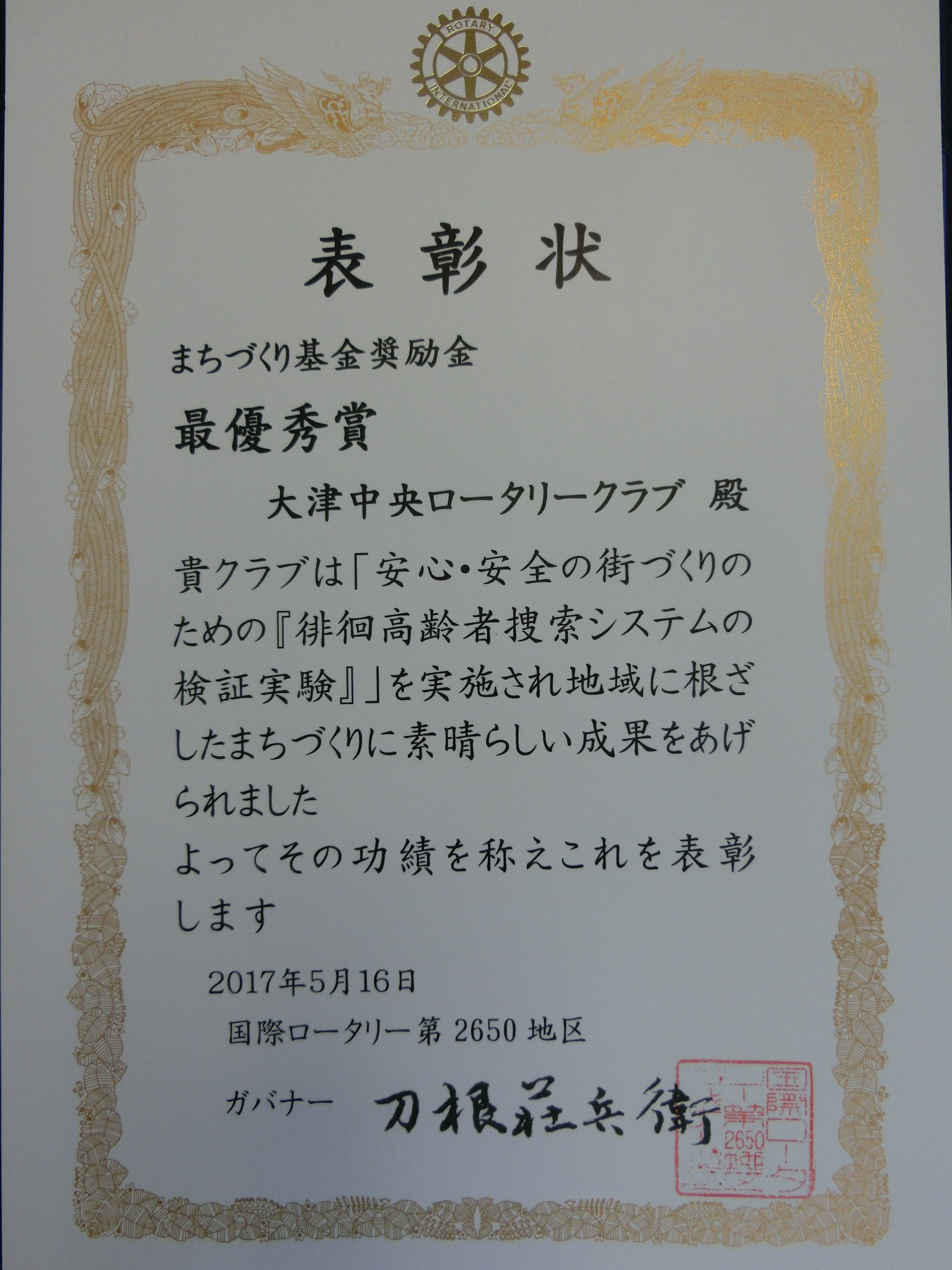 2650地区『2016-17年度まちづくり基金奨励金』最優秀賞 受賞