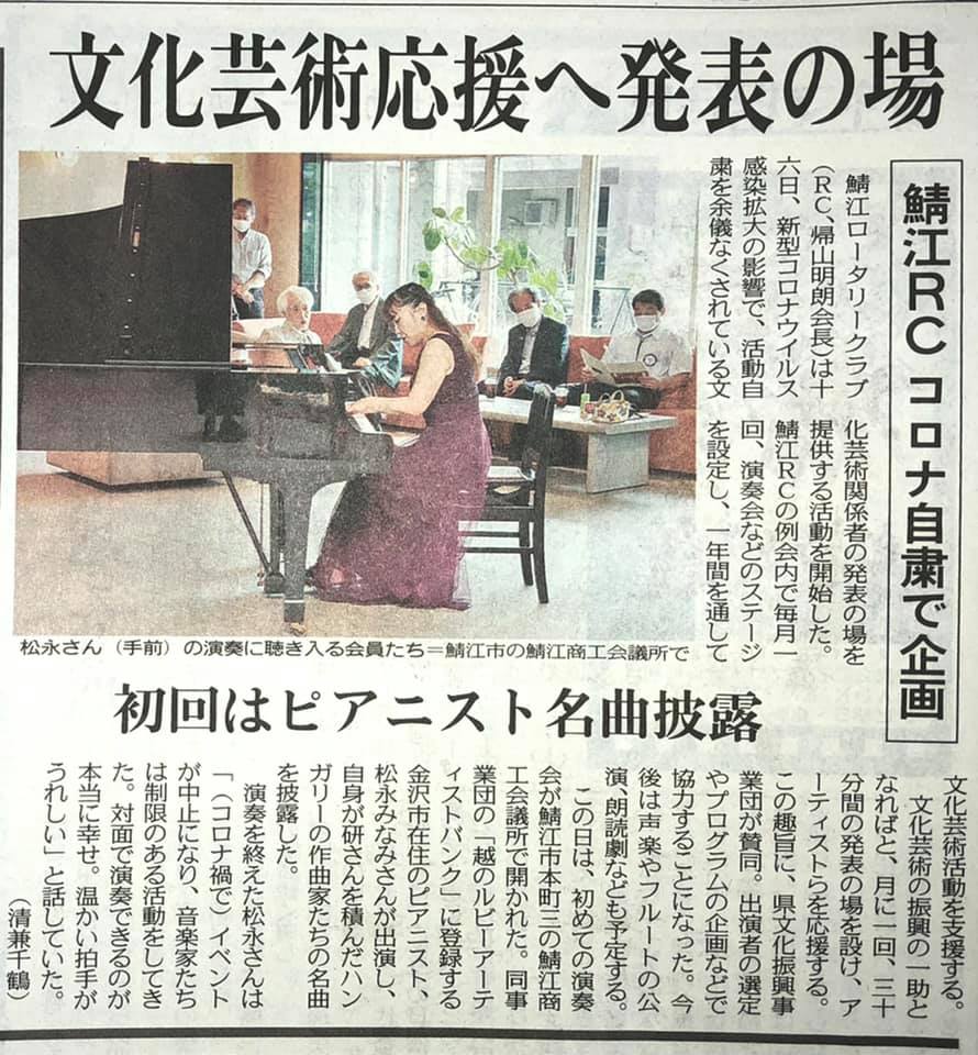 鯖江ロータリークラブでは、7月16日(金)、新型コロナウイルス感染拡大の影響で、活動自粛を余儀なくされている文化芸術関係者の発表の場を提供する活動を開始しました。