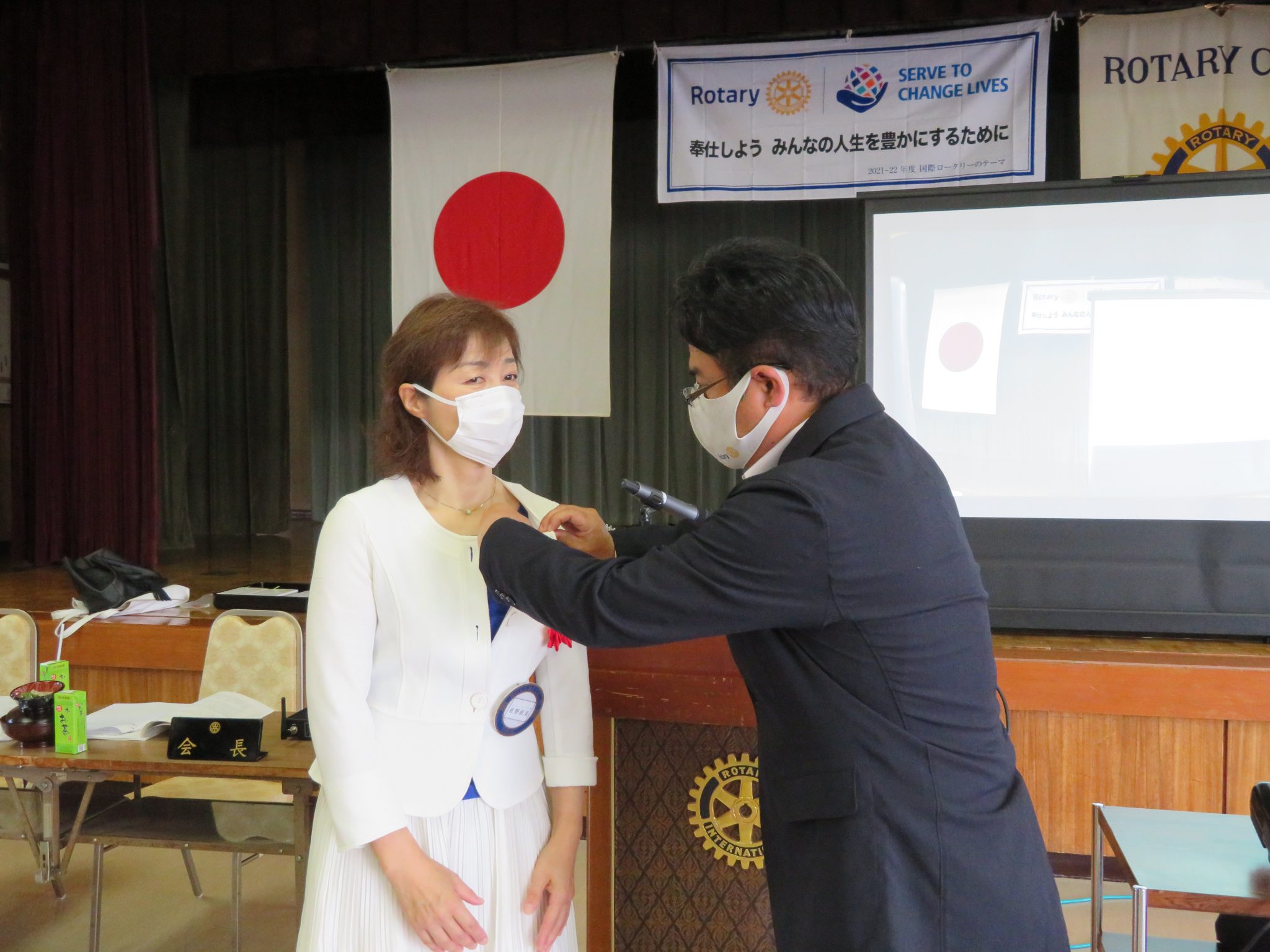 鯖江ロータリークラブでは7月2日(金)に新年度初めての例会を開催。帰山明朗会長、佐野直美幹事による新体制がスタートしました。例会では野中直前会長より帰山新会長へ、瀧ヶ花前幹事より佐野新幹事へのバッジの引継ぎも行われ、会長方針が発表されました。