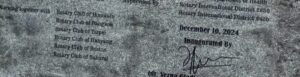 4枚目の写真は工事の完成を記念して建てられた石碑です。メジャードナーが京都クラブであることが記されておりますが、5枚目の写真をご覧いただければわかりますように、ホノルルRCやボストンRCなどの京都クラブの姉妹クラブの他に、文字列の一番下のところではありますが、ワーキングパートナーとして「Rotary Club of Sakurai」と刻まれています。これは、会員の皆様もご承知のとおり、当初、我がクラブが、グローバル補助金を使っての国際奉仕事業としてインドネシアでの日本型住血吸虫症根絶事業に着手しようとして、現地調査に行き、現地クラブのPalu RCを見つけるところから始め、今回の工事の過程でも両クラブを繋ぐお手伝いをさせていただいたことへの感謝の気持として刻んでいただいたものです。
