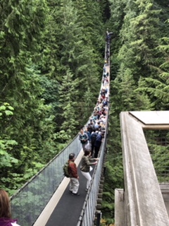バンクーバーでは中田会員の会社の材木の取引先のカナダ支店の皆さまに、市内をご案内いただいたり、夕食をご一緒いただいたりと、大変お世話になりました。何よりも、製材所の見学をさせていただいたことは生涯忘れられない貴重な体験でした。直径が私の身長を超えるような丸太が、巨大なチェーンソーで次々と角材や板状のものに切り分けられていく過程を見学させていただきました。これぞ、ロータリーならではの職業奉仕、職場見学!ロータリーの仲間との旅でなければ経験できない素晴らしい体験でした。昼食をとったパブは、製材業には欠かせない貯木場が見える川沿いのお店の屋外席。最高気温が17度前後ですのでヒーターとひざ掛け毛布で肌寒さをしのぎました。