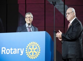 「三十数年前、ロータリーがポリオ撲滅に向けて活動し始めたころには年間35万件もの症例があった。2007年、ビル・ゲイツ財団がロータリー財団とともに活動するようになったころには年間1,700件を超えるくらいのところにまではなっていた。しかし、それをゼロにするのには、それまで以上のお金がかかる。なぜならば、最後に残った発症例のある国々は、戦争があったり、大変な奥地であったりで、ワクチンがあっても届けるのが困難な地域であったからだ。ロータリアンはそのような地域にまでワクチンを届けるために自らワクチンの接種に赴くなど、危険な地域にまでワクチンが届くように努力を惜しまなかった。ロータリアンの勇気と尽力を讃えたい。」