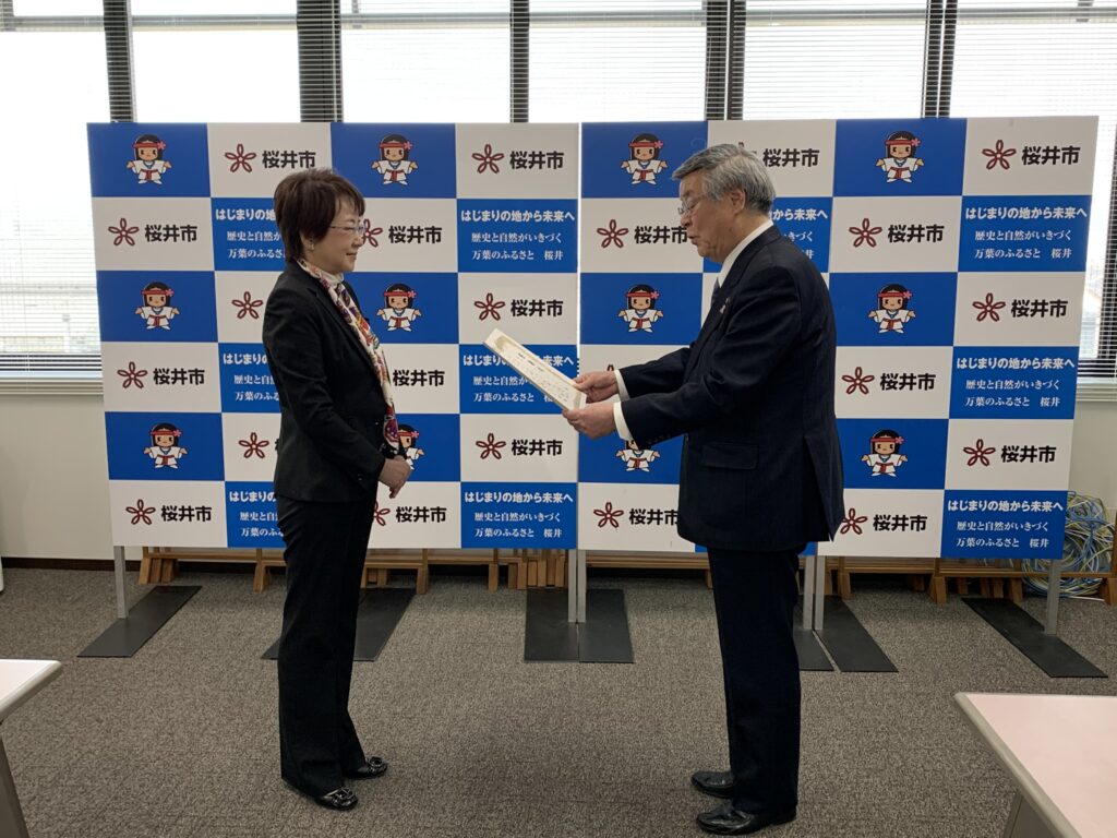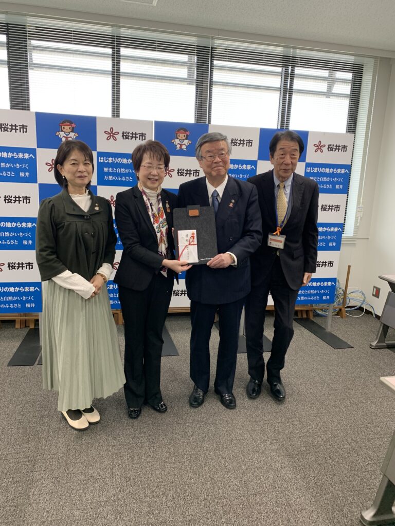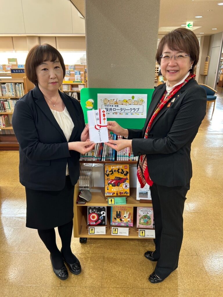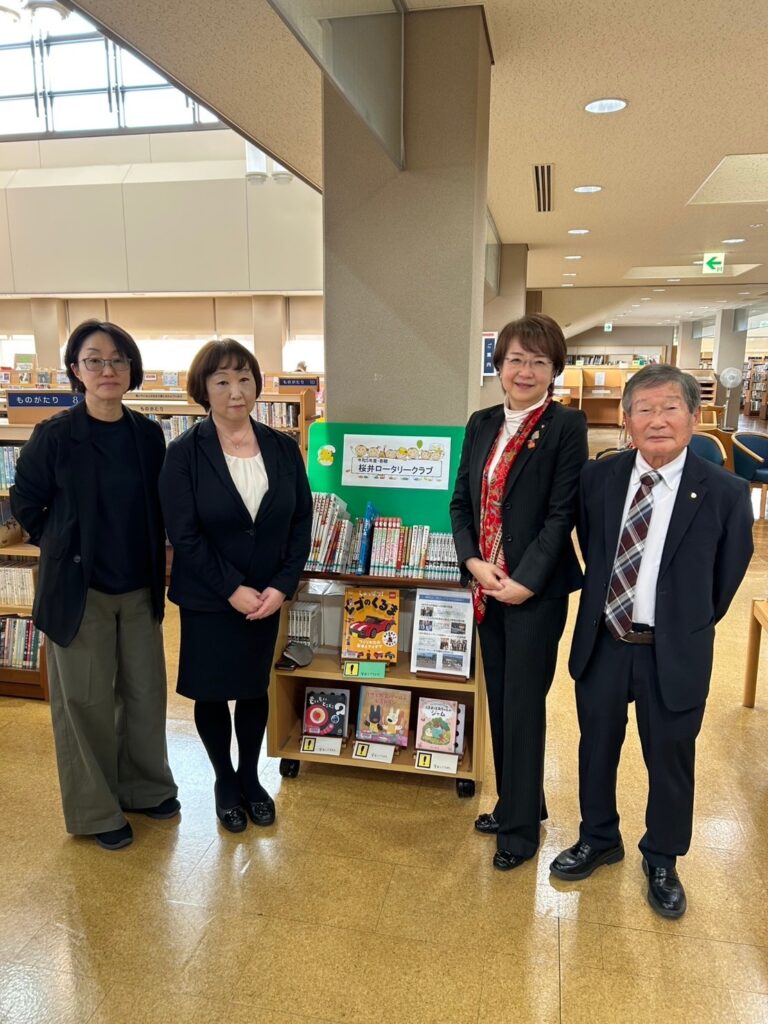 12月2日14時より、桜井市立図書館にて、図書の贈呈式が開催され、内田会長、北口会長エレクト、中谷社会奉仕委員長の3名が出席しました。贈呈式では、内田会長より桜井市立図書館の迫館長に図書目録を手渡されました。