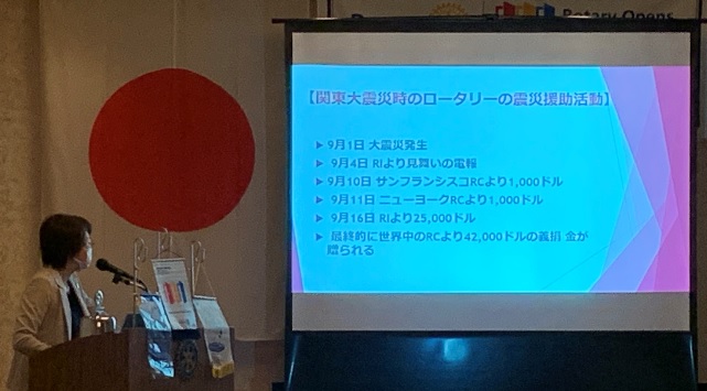 日本に最初のロータリークラブができたのは、1920年(大正9年)、今年は日本のロータリー100周年です。のちに「米山奨学金」の名前の由来ともなる米山梅吉が初代会長、日本人初のロータリアン(在米中、ダラスロータリクラブに所属)であった福島喜三次が初代幹事を務めた東京ロータリークラブの誕生です。2番目は大阪RC、3番目は神戸RC、4番目は名古屋RC、5番目は京都RCです。日本にロータリーがやってきて間もない1923年9月1日、関東大震災が起こります。地震発生の3日後には、国際ロータリーからお見舞いの電報が届き、10日にはサンフランシスコRCから1,000㌦、11日にはニューヨークRCから1,000㌦、16日にはRIから25,000㌦、最終的に世界のRCから42,000㌦の義捐金が寄せられました。当時の電信事情、世界情勢に鑑みれば、世界の東の果ての国にすごい速さですごい金額の義捐金が届けられたことに驚くばかりです。第2次世界大戦の影響で1940年国際ロータリーを脱退、1949年に復帰するまでの間も例会は続けられており、敵国から来たロータリーへの風当たりを避けるため、例会場には「日の丸」掲揚し、「君が代」を斉唱するようになったとのことです。現在、日本には、約2,300のクラブがあり、会員数は9万人前後で推移しています。世界には、約35,000のクラブ、およそ120万人の会員登録があるそうです。