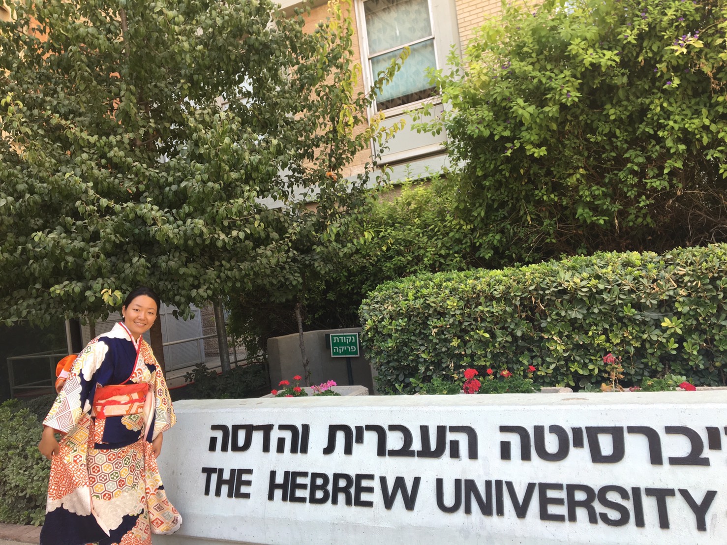 ヘブライ大学キャンパス玄関にて振袖を着ての記念撮影。真夏の着物はとても大変だったそうですが、クラスメイトや来賓の方々が大変喜んでくれたそうです。