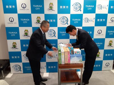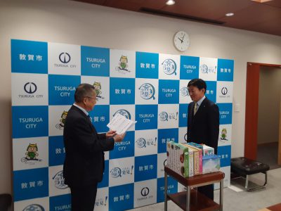 今年度地区補助金事業として、敦賀市内の小学校全校(11校)に優良図書を寄贈します。各学校への配布に先立ち敦賀市役所を訪れ、敦賀市長 米澤光治様、敦賀市教育長 上野弘様に優良図書の贈呈式を行いました。中川堅一会長、中村紀明副会長、木原茂豪公共イメージ委員長、薮内弘昌公共イメージ委員の4名で訪れ、中川会長が代表して贈呈目録を読み上げました。その後、市長や教育関係者と懇談をし、読書を通して児童の健全育成が大いに期待できるということでした。後日、敦賀ロータリークラブ会員総出で図書贈呈シールを貼付し、手分けして優良図書を各学校にお届けする予定です。