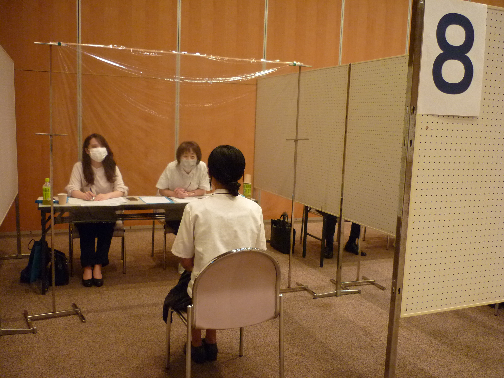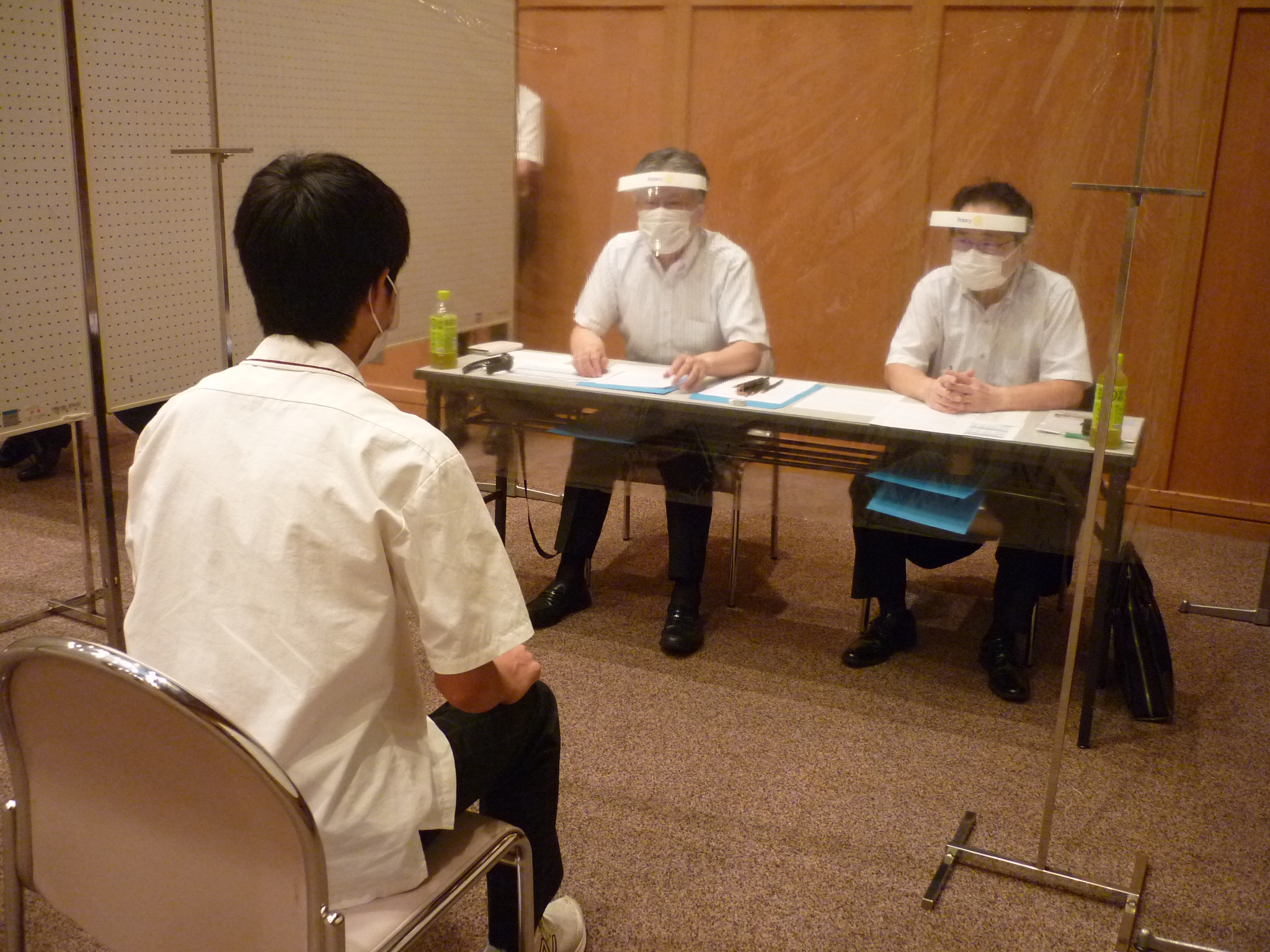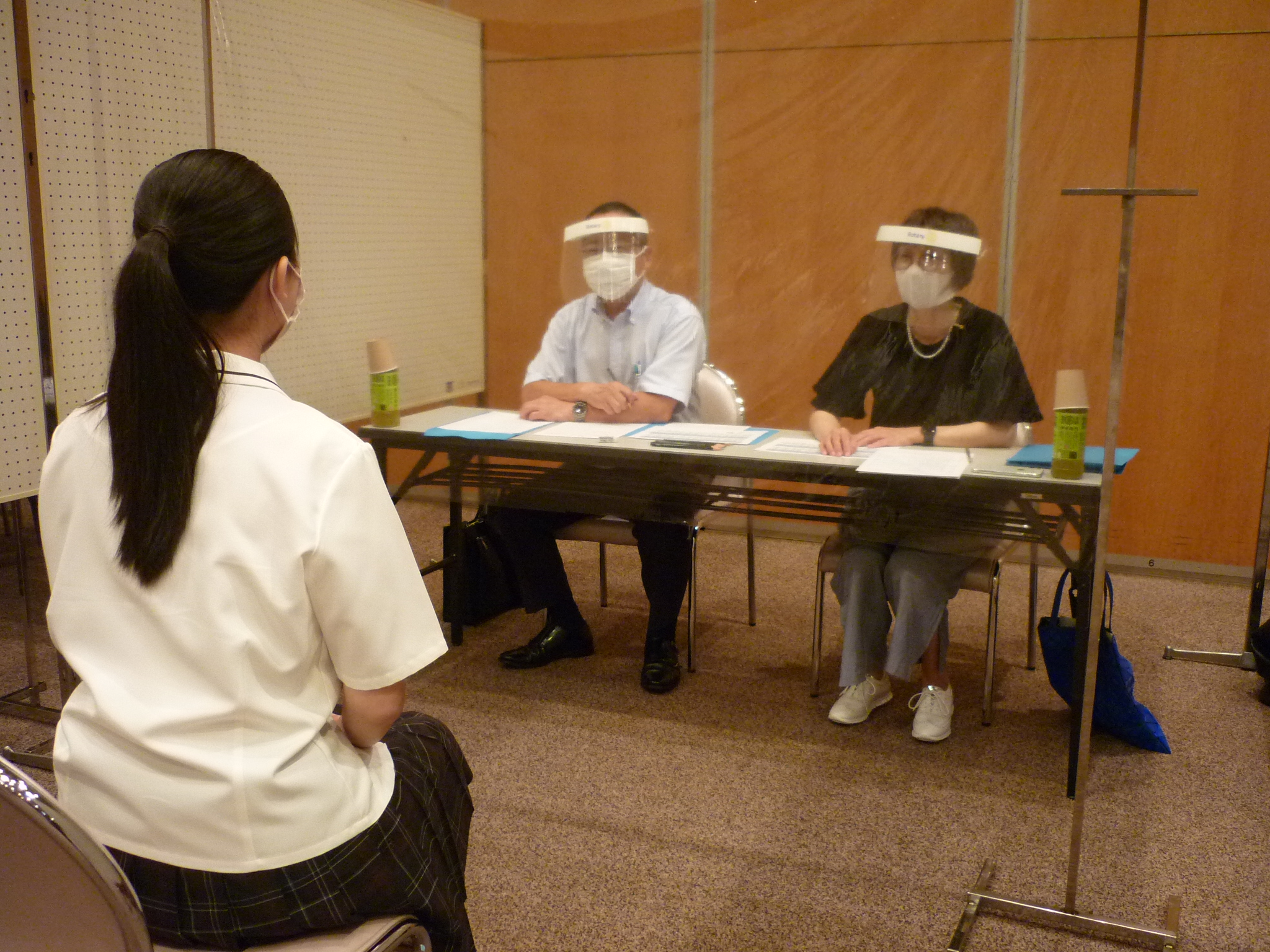 ※今年も新型コロナウイルス感染予防のため面接官役はフェイスシールドとマスクを着け、生徒との間には透明のフィルムを設置した。