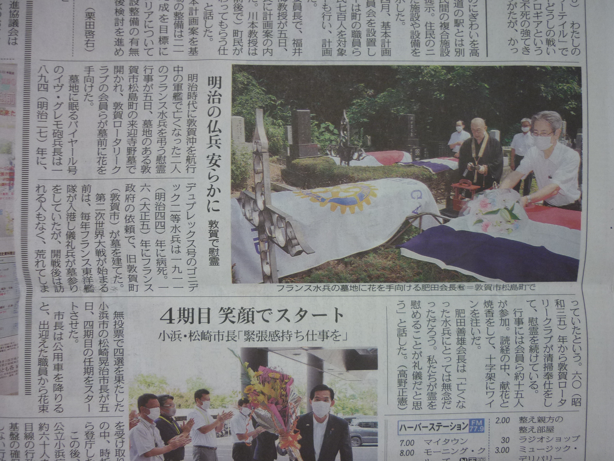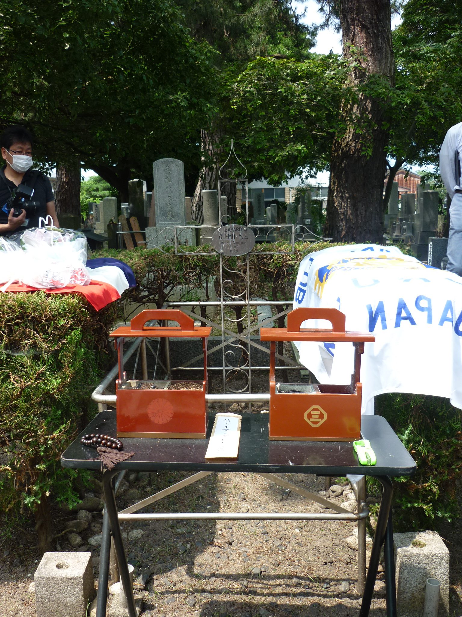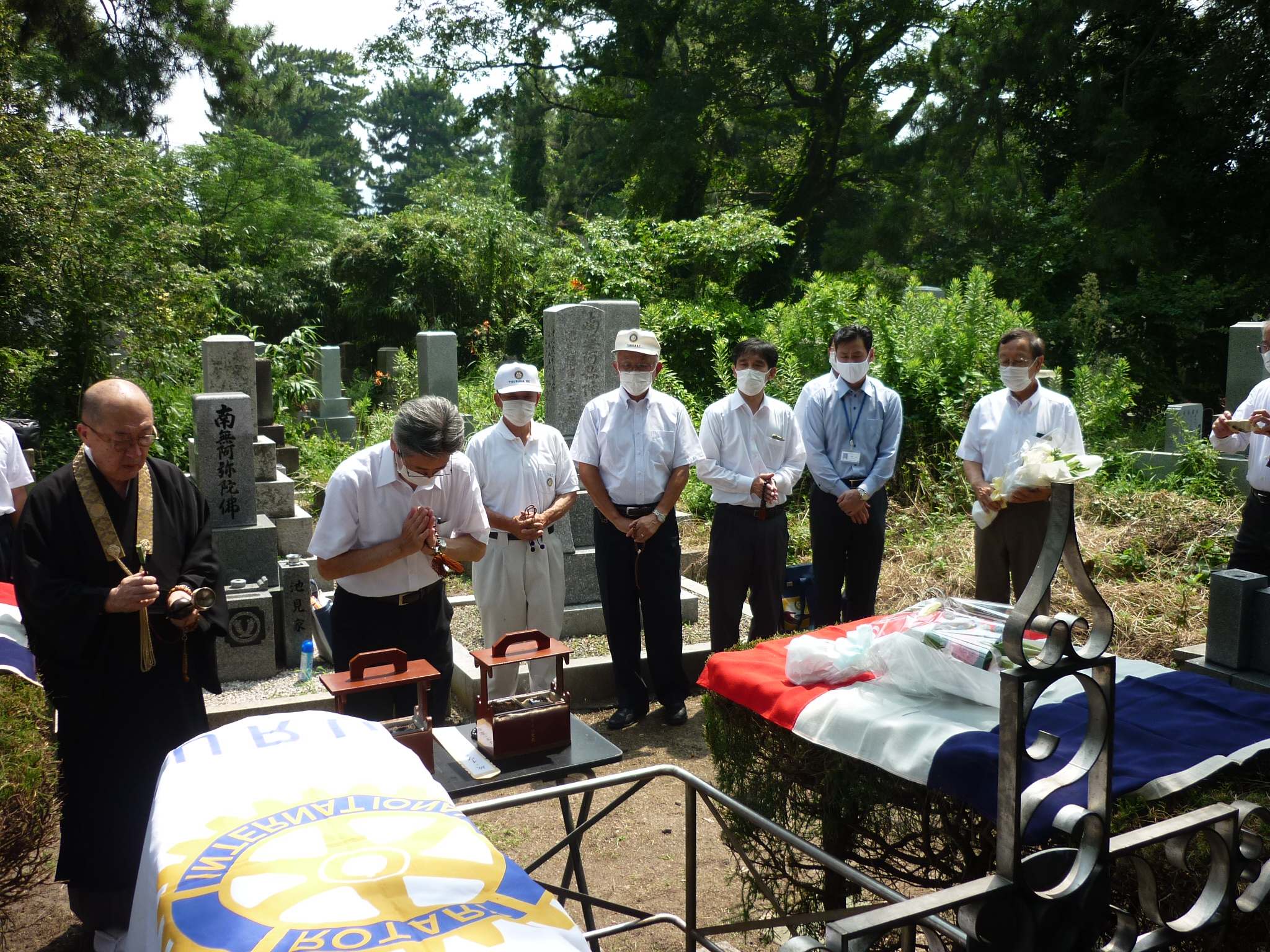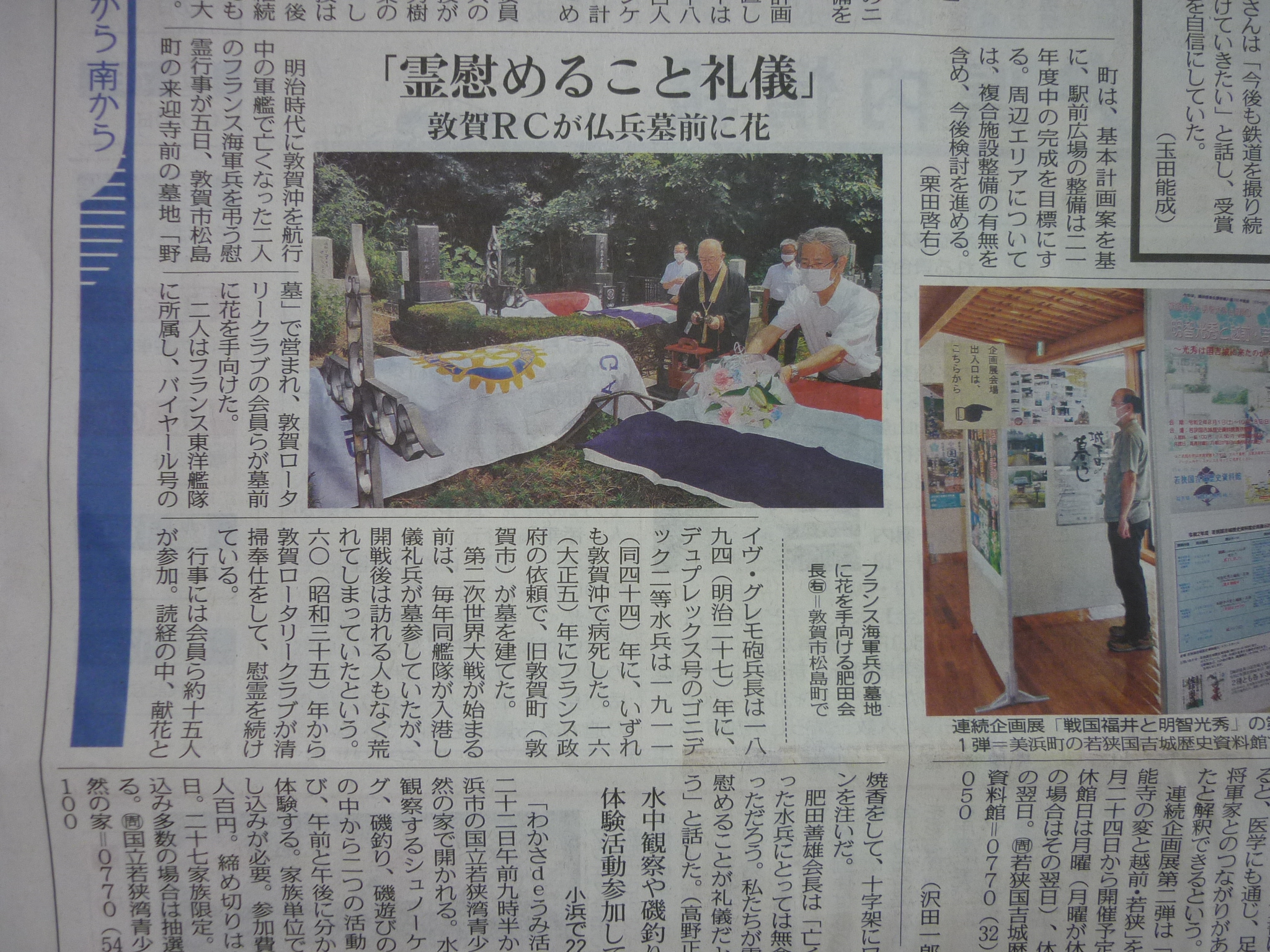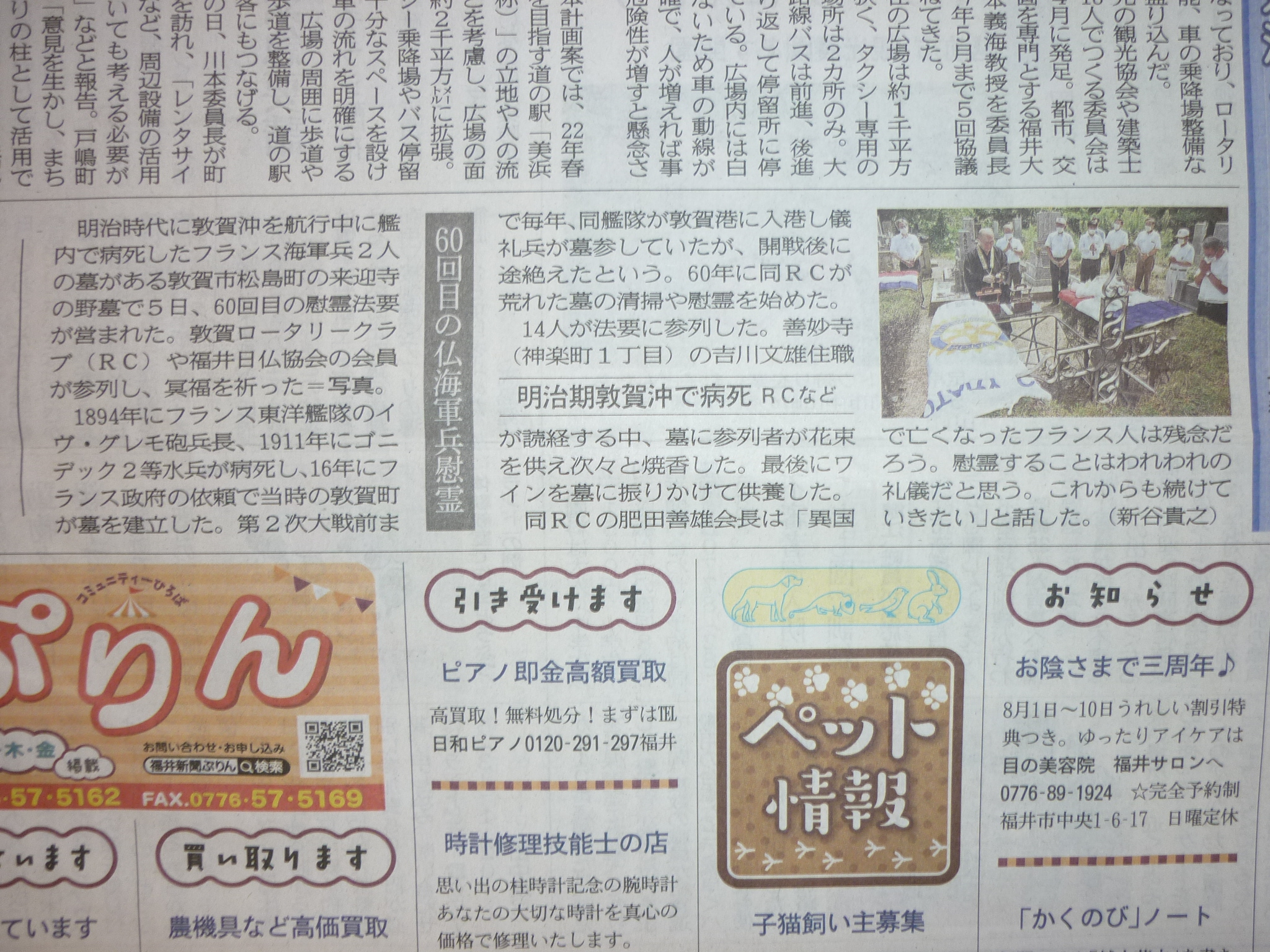 8月5日(水)、来迎寺にて60回目のフランス兵墓地の清掃及び供養を行いました。クラブ参加者は12名。昨年に引き続き福井日仏協会の大城閑会長と坪田利一事務局長が来敦、一緒に供養しました。墓周辺の生け垣に日仏両国旗とロータリー旗を飾り、善妙寺住職の吉川会員が読経する中、会員たちは次々に焼香。墓にワインを振りかけ、異国の地に眠る仏兵士の冥福を祈りました。