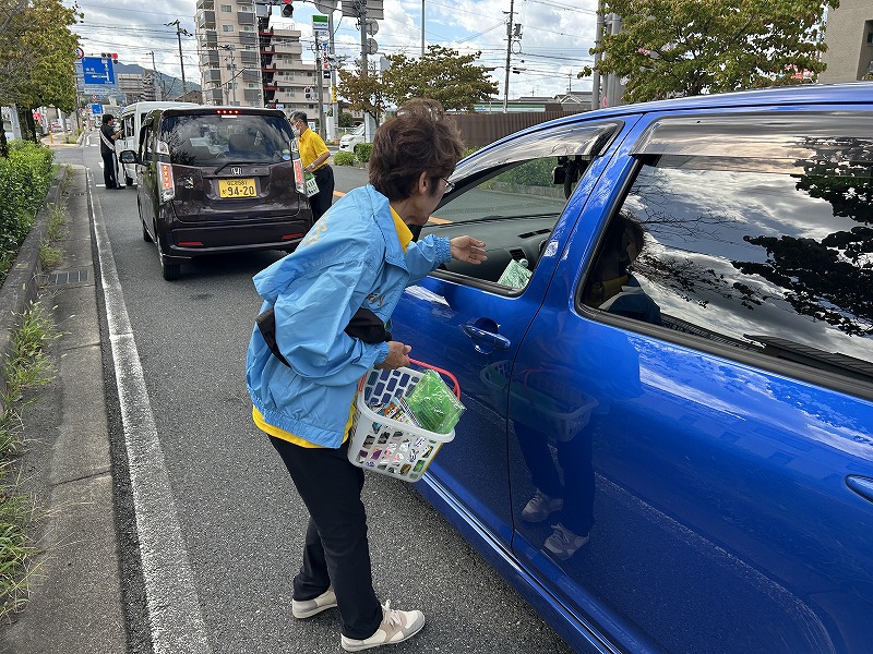さらに、交通安全週間には主要交差点で通行人や通行車両へ啓発グッズを配布し、交通安全の普及活動を行いました。