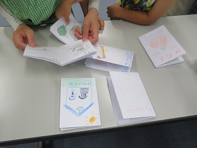 最初は絵本の読み聞かせから始まり、いよいよ作業開始。自分の名前の頭文字から8枚のしりとりを繋げて最後「ん」で終わるというものです。簡単のようで意外と難しいです。