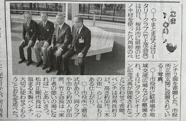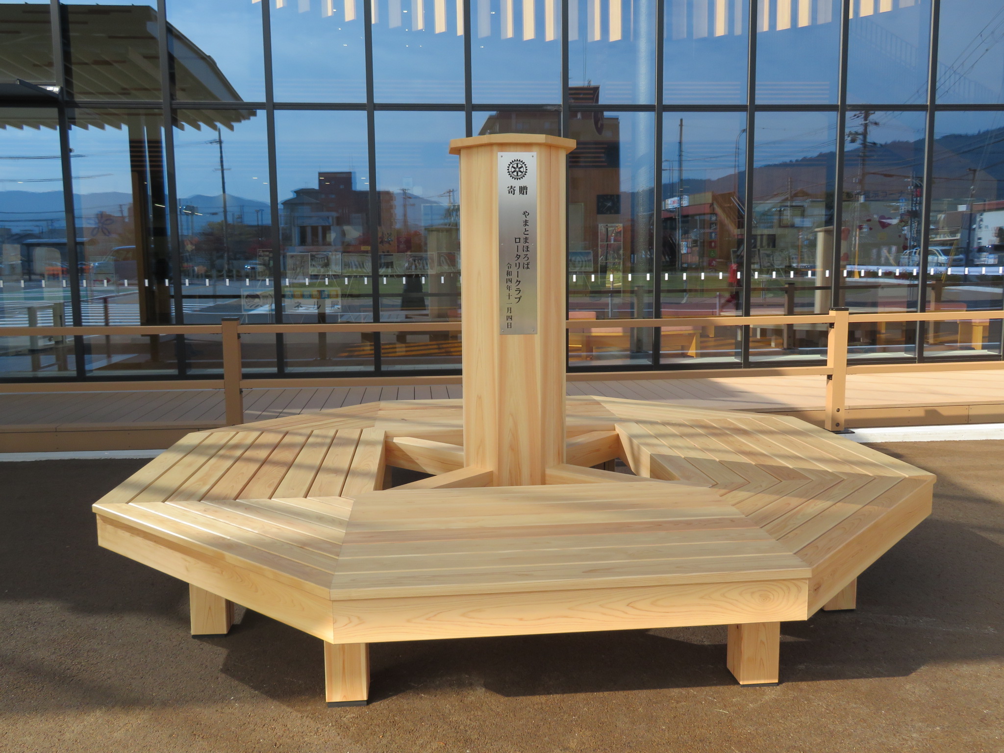 「大和は国のまほろば・・・」と謳われる、四方を青垣に囲まれる麗しのこの地桜井に50年ぶりに新しい市庁舎がお目見えとなり、やまとまほろばロータリークラブは、今年度社会奉仕事業として、この市庁舎前の広場が「市民の憩いの場となれば・・」という願いを込めて、 大型八角形ベンチ(2台)を寄贈いたしました。