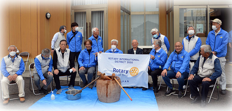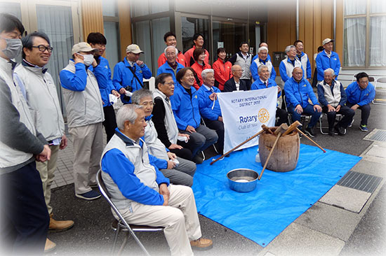 餅つきを体験する事で日本の伝統食である餅を身近に感じてもらおうと、24人のロータリアン(ロータリーメンバー)が集結。