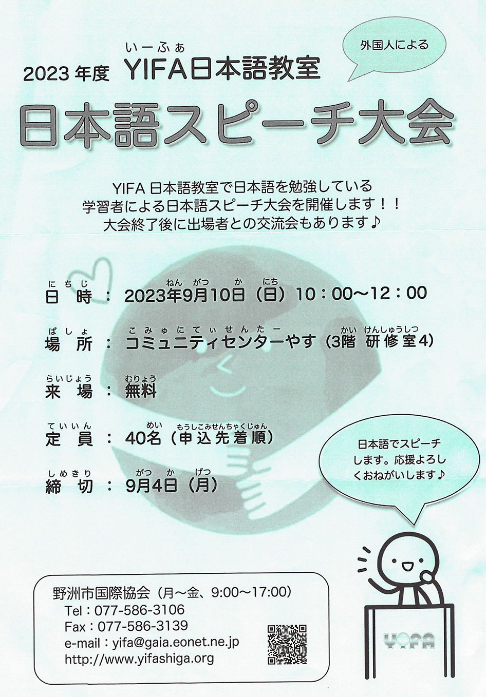 今年度、初の試みとして、野洲市国際協会主催の外国人による日本語スピーチ大会に協賛。