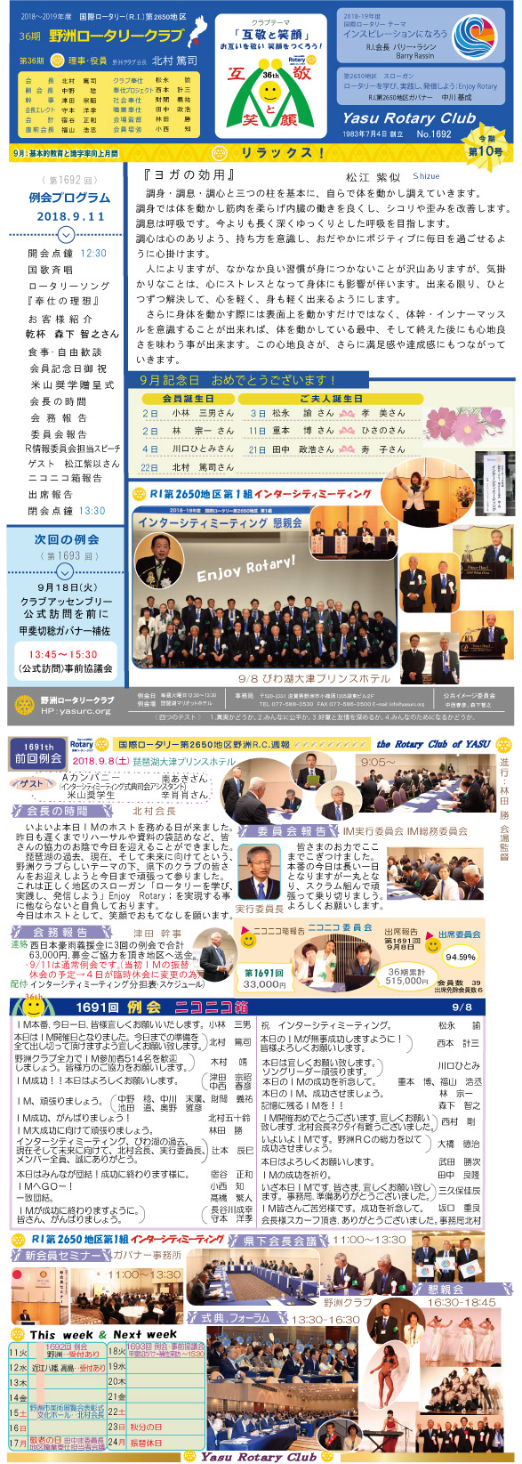9月8日、土曜日、びわ湖大津プリンスホテルに於いて、国際ロータリー第2650地区第1組のインターシティミーティングが、野洲ロータリークラブのホストの下、開催されました。