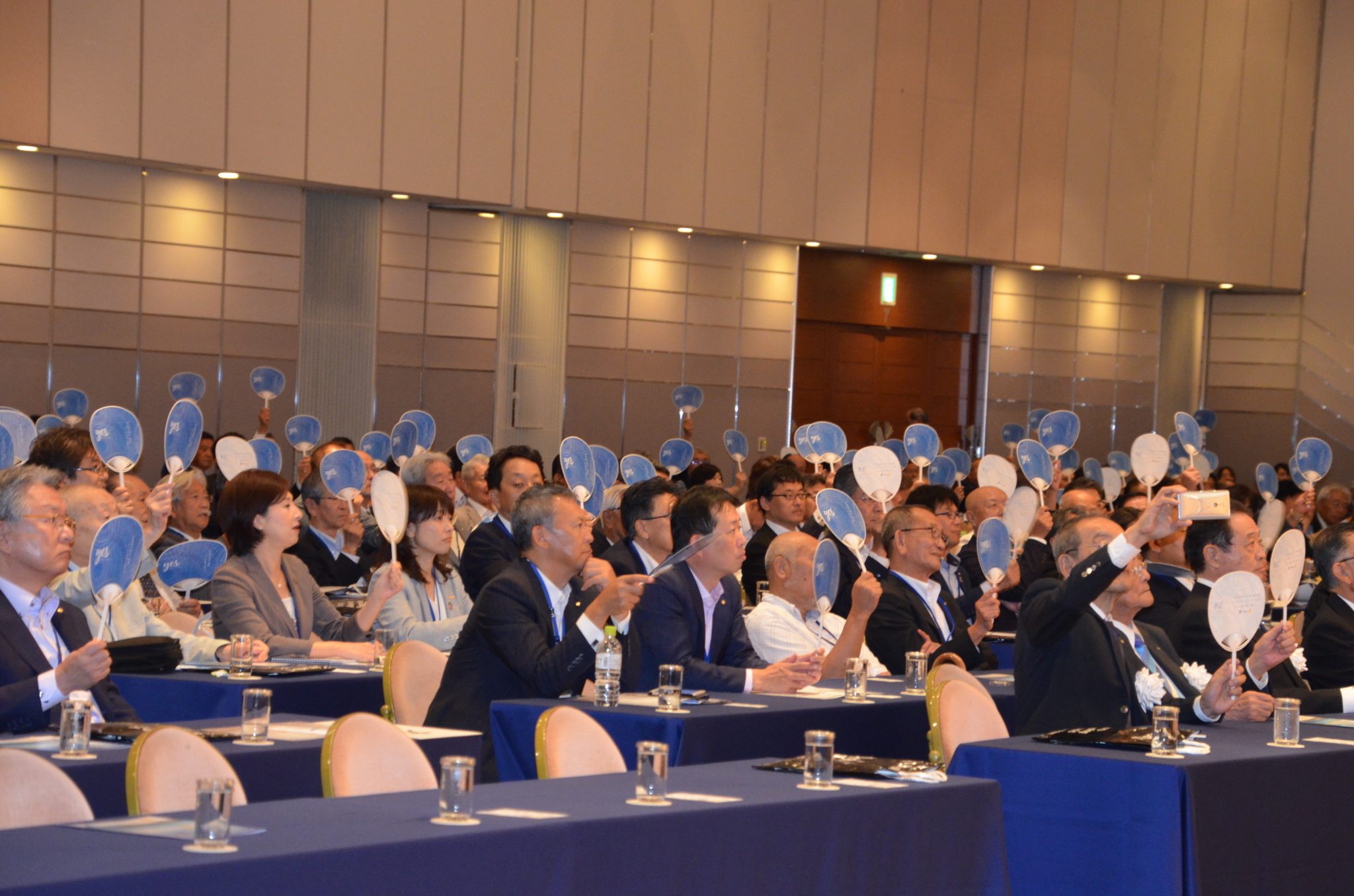 第2部はフォーラム、事業発表。びわ湖の過去、現在、そして未来に向けてのテーマでびわ湖について学ぼうと、琵琶湖環境科学研究センターの工学博士、佐藤祐一先生にお越しいただき、会場の全員がうちわでイエスノーと意思表示をし、フォーラムに参加しました。