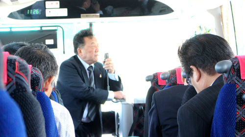 その他の会員は午後からの本会議に向け、11時に野洲をバスで出発。ひこね市文化プラザに向かうバスの車中で、記念すべき1600回の例会を開催しました。会長は先に会場入りをしている為、中野副会長が会長代行。田中会長から次回の例会で改めてお祝いがあるとの話も・・。