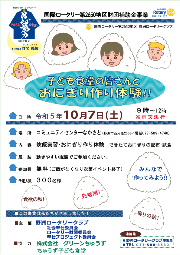 子ども食堂の子どもたちや親御さんとの「炊飯実習体験とおにぎり作り体験」を、実りの秋、新米の季節にあわせて開催します。国際ロータリー第2650地区の財団補助金を活用しての事業となります。