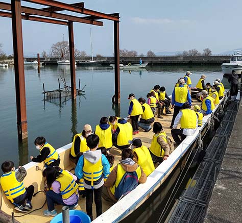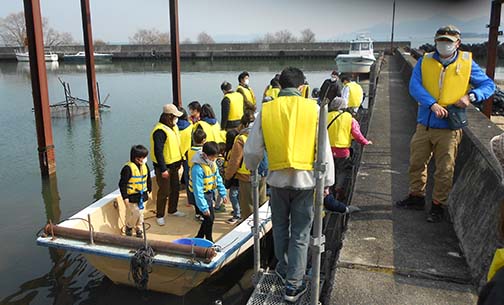 救命具をつけて、びわ湖の生態調査に向かった子どもたちは初めてのびわ湖の船に、やや緊張気味でした