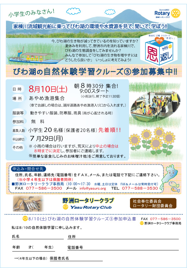 野洲ロータリークラブでは、8月10日(土)環境学習クルーズ⑤に