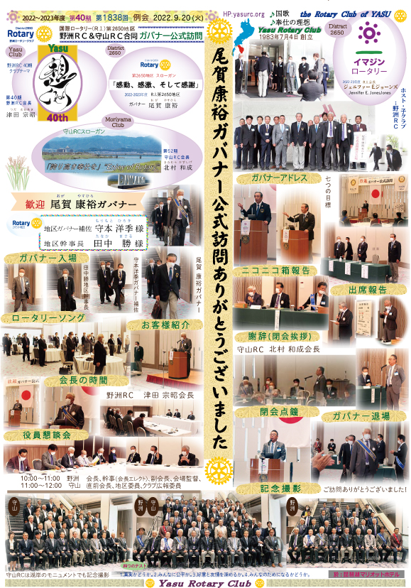 台風一過の9月20日、琵琶湖マリオットホテルにおいて、親子クラブ、守山RCと野洲RCの合同ガバナー公式訪問が、野洲RC(子クラブ)がホストを務め、無事開催されました。