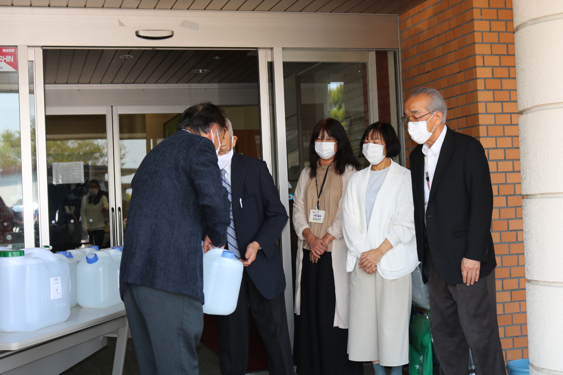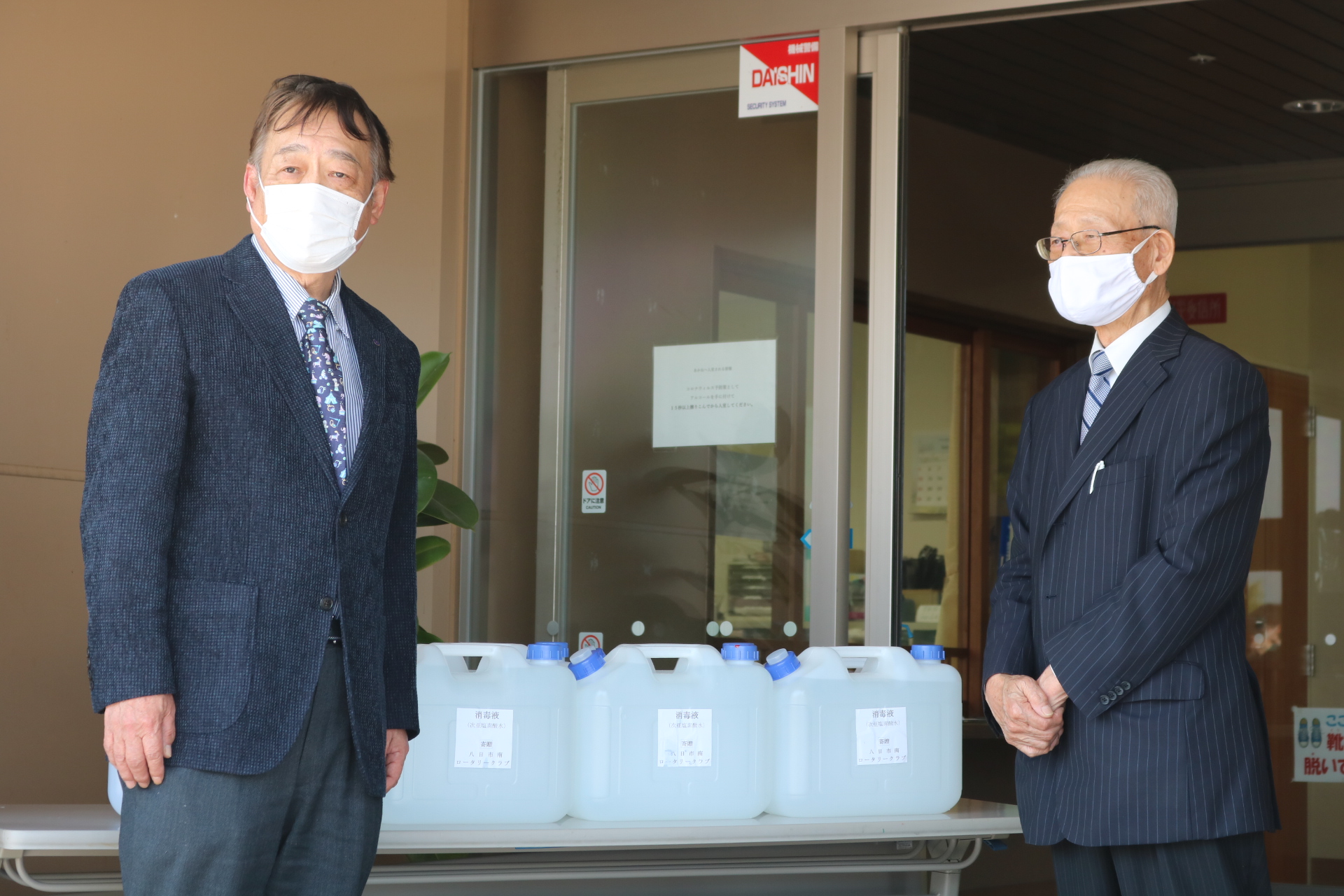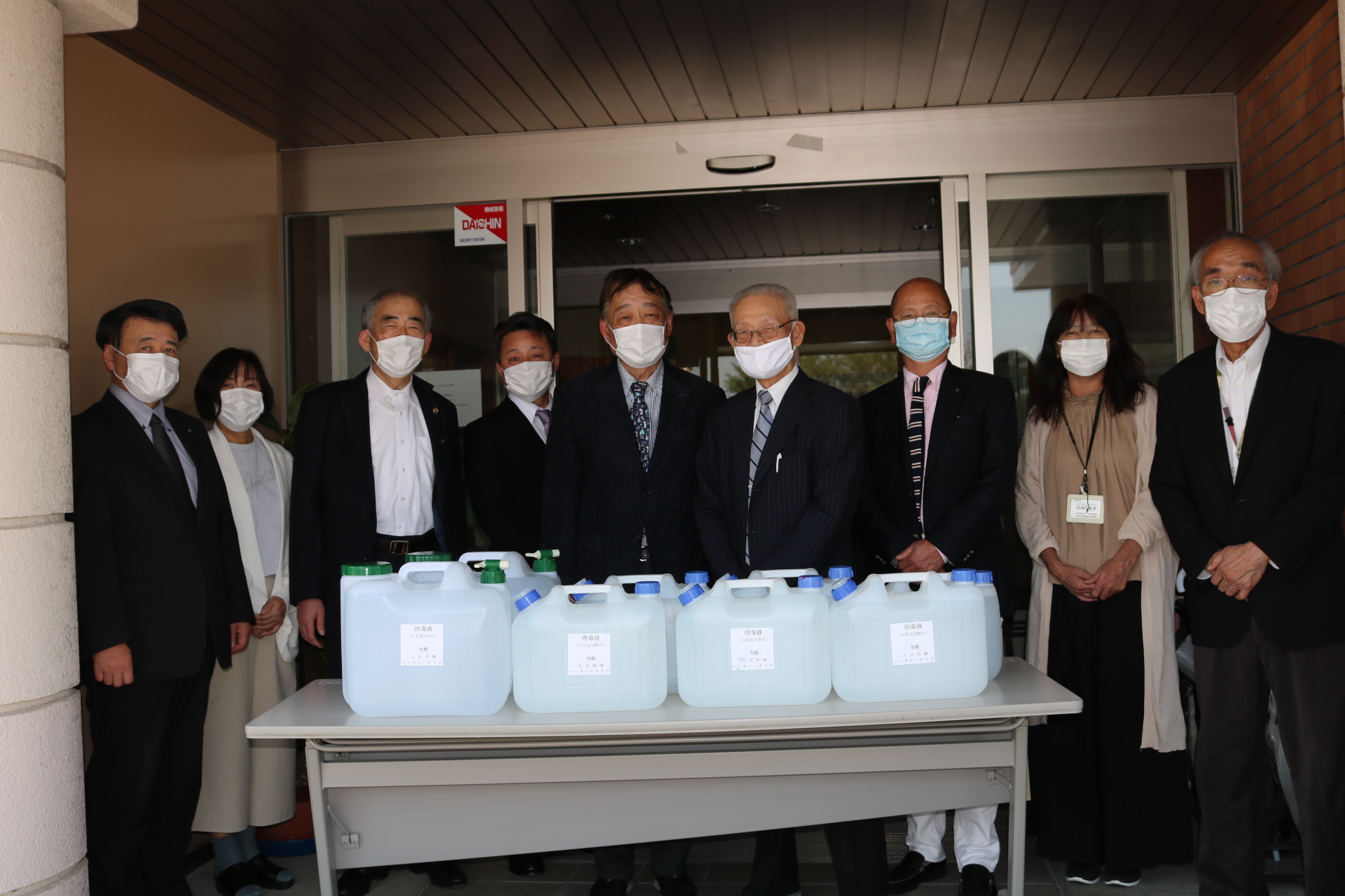 4月30 日木 曜日、東近江市障がい者支援施設所に対して、消毒液(次亜塩素酸水)100ℓを届けてまいりました。当クラブの下田会員より地元企業として貢献したいとご協力頂いて、会員企業の無償提供により、施設長に西賀 隆夫会長よりお渡し致しました。西賀 隆夫会長は、「ささやかですが、感染予防に使って下さい」と述べ、施設長はじめスタッフの皆様方から、大変喜んで頂けました。今後も、身近なところで支援事業を続けていきたいと考えています。