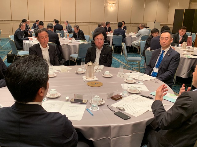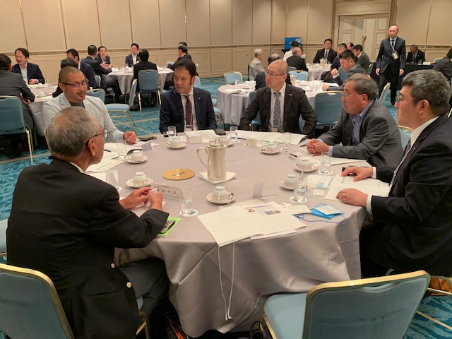 プログラム後半の7つのテーブルに分かれたグループ討議では、地区ロータリー情報委員が進行役を務めて、新会員の皆さまにご自分の職業を語っていただくとともに、自分のクラブでの体験や、ロータリークラブが掲げる職業奉仕の理念、これからロータリークラブにどのように向き合っていきたいか、など様々な話題を通じて、初めての他クラブロータリアンとの交流を楽しんでいただきました。どのテーブルでも、初対面の人達による話会いとは思えないほどに、笑い声や笑顔にあふれた雰囲気に包まれていたことが印象に残りました。