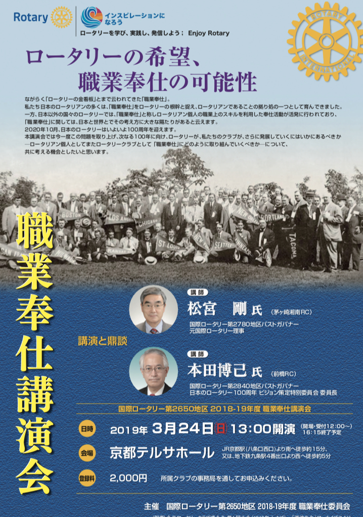 職業奉仕委員会 職業奉仕委員会 各種資料ダウンロード 職業奉仕委員会向け お知らせ 活動報告 お知らせNEWS 職業奉仕講演会開催のお知らせ3/24 2019.01.16 来たる3月24日(日)職業奉仕講演会を京都テルサホールにて実施致します。 ご案内をご覧頂き、各クラブよりお申込みのほどお願い致します。 詳細はこちら