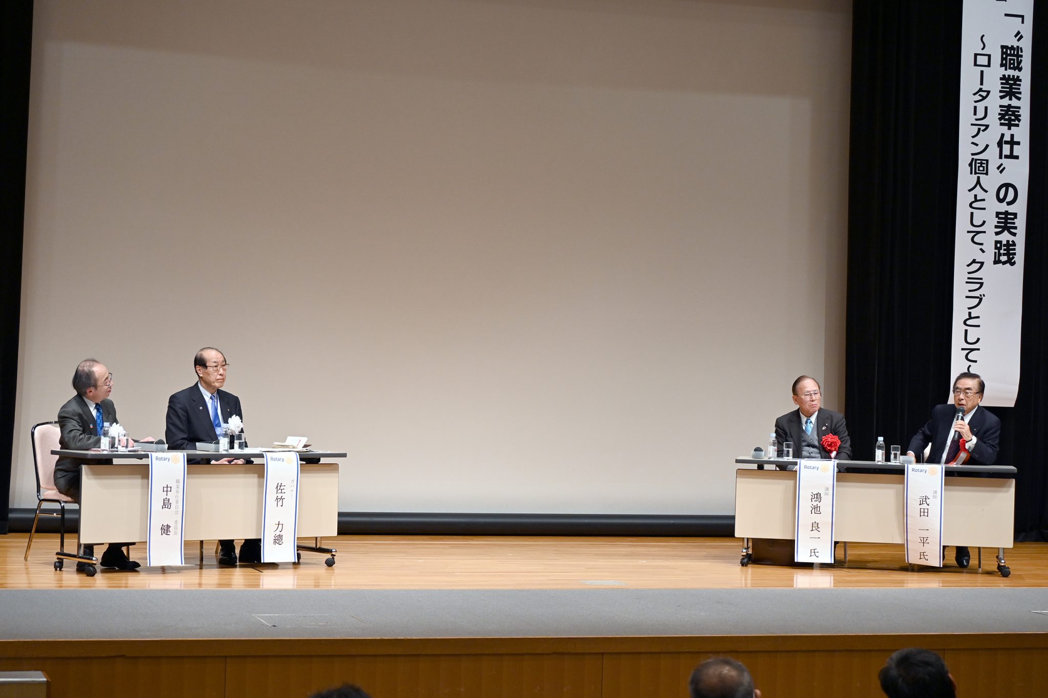 講演会の後半は、佐竹ガバナーも交えて座談会が行われました。前半の講演内容の深掘りを行うと共に、現代の職業奉仕が目指すべき価値の一つとしてSDGsについても言及されました。