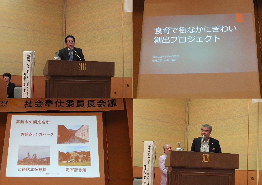 主な内容:各クラブの社会奉仕委員長にお集まりいただき、2650地区内における様々な社会奉仕活動をご紹介し少しでも参考にしていただける事例を紹介しました。特に昨年度のまちづくり奨励金の最優秀賞を受賞された