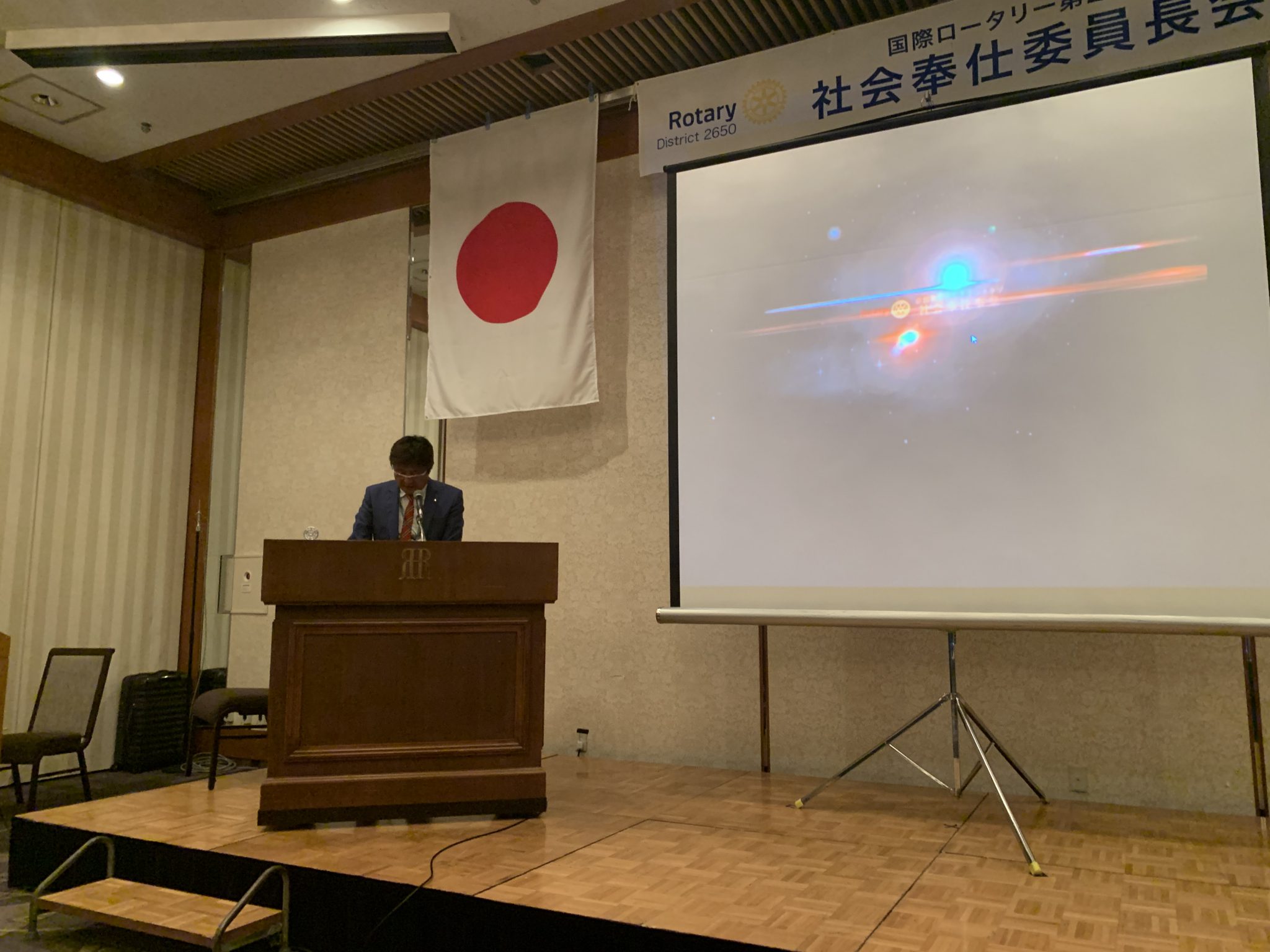 地区社会奉仕委員長 影近義之よりご挨拶と今回の開催趣旨、内容を説明させていただきました。
