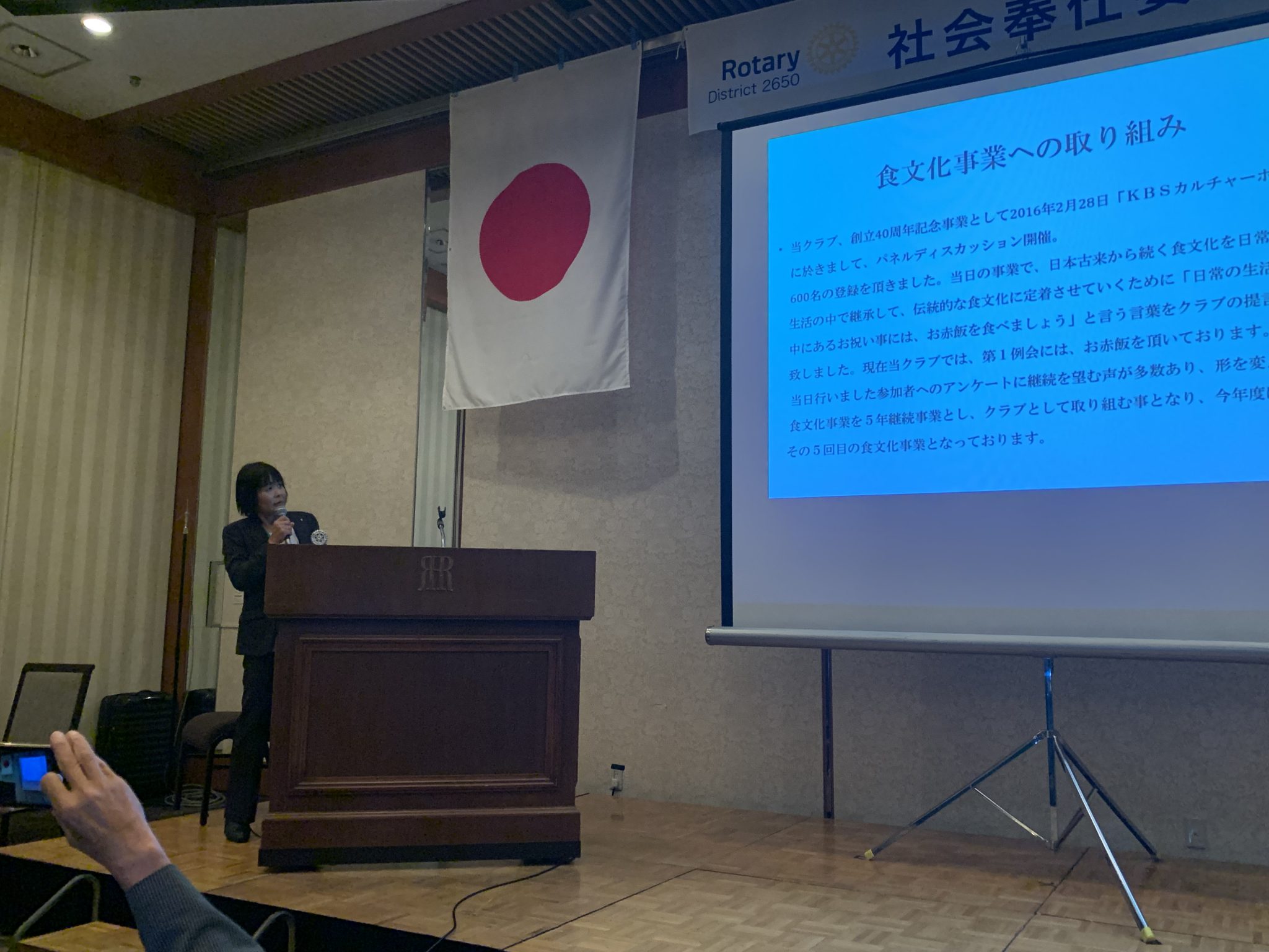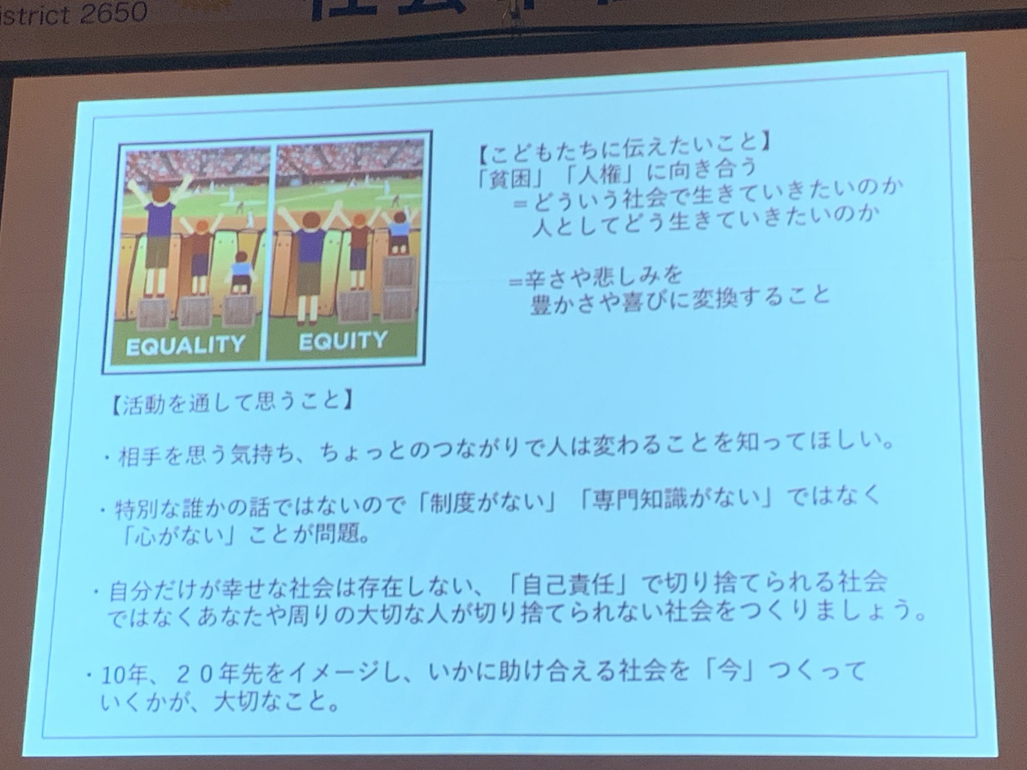 今回のセミナーは特定非営利活動法人 西成チャイルド・ケア・センターの代表理事りあります川辺康子様のセミナーがあるという事と、発表クラブの素晴らしい事業説明を聞きたいという思いからご参加いただけたものと認識しております。特に地区内においては「子どもの貧困」や「子ども食堂」などの事業を行うまた行おうとするクラブも出てきているようでございます。そのような観点からも今回のセミナーに興味を持っていただいたのではないかと感じております。