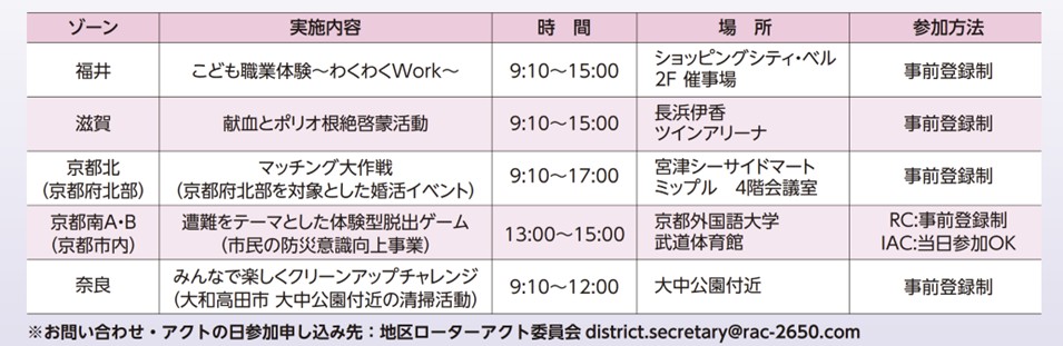 今年度は3月15日(日)に、「アクトの日」を地区内一斉の奉仕活動デーとして開催いたします。この活動を通じて、それぞれの地域社会のニーズや問題解決に対し、ローターアクターとして何ができるか考え行動する意識の醸成と、地域社会へのローターアクトの公共イメージ向上に繋げたいと考えております。地区内各ゾーンにおきまして、下記の通りに様々なイベントの開催を準備をいたしております。