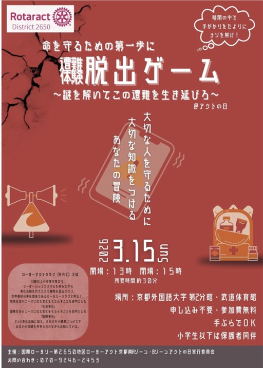 今年度は3月15日(日)に、「アクトの日」を地区内一斉の奉仕活動デーとして開催いたします。この活動を通じて、それぞれの地域社会のニーズや問題解決に対し、ローターアクターとして何ができるか考え行動する意識の醸成と、地域社会へのローターアクトの公共イメージ向上に繋げたいと考えております。地区内各ゾーンにおきまして、下記の通りに様々なイベントの開催を準備をいたしております。
