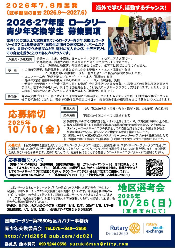 国際ロータリー第2650地区(京都、福井、滋賀、奈良)では、2026年の夏に出発し、約10カ月の交換留学プログラムを体験できる「2026-27年度ロータリー青少年交換学生」を募集中です。詳しくは募集要項をご覧ください。
