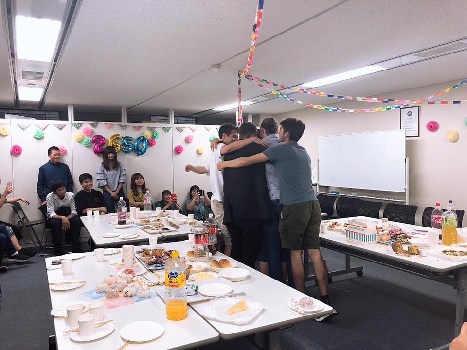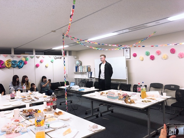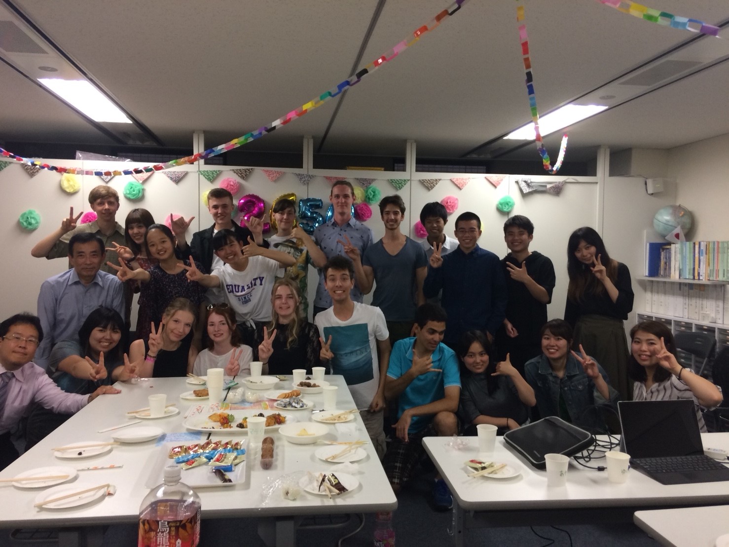 その後はパーティーを開催しました。受入学生には母国のお菓子を作って持ってきて頂きました。国別クイズをしたり、ROTEXが作成した思い出ムービーの放映などを行いました。
