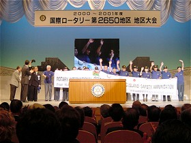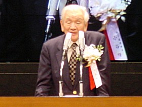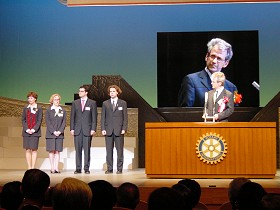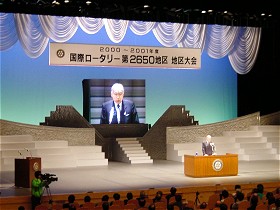 記念講演「ロータリーと私」 R.I.会長代理 千宗室様 小さい頃からのロータリーとの関わり、三代にわたるロータリアンとなったこと、チャーターメンバーとして子クラブを育てたこと等、感銘を受けるお話を聞くことができました。最後に、物質社会・利己主義の世の中、せめてロータリアンが謙虚になって世界の人々と仲良くすることで、必ずや世界平和が訪れると結ばれました。 |