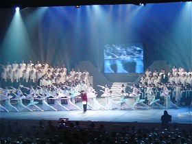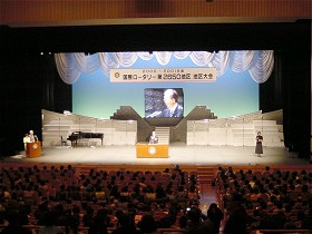 メモリアルステージ挨拶 ガバナー 山崎時雄様 最後に再び場所をグランドホールに移し、市民参加でメモリアルステージの開幕です。山崎ガバナーは一般市民の皆さんに対し、ロータリークラブの業績を報告され、大勢の市民参加に感謝されていました。メモリアルステージは「彦根音楽物語」と題し、女優の斉藤慶子さんがナレーションをされ、少年トキオの心の成長物語を軸にしたファンタジックなステージです。 |