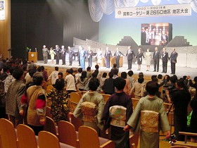 「手に手つないで」斉唱 大会実行委員長・清水修三様の閉会挨拶に続き、会場全員が輪になって「手に手つないで」を斉唱し、最後に山崎ガバナーの閉会点鐘で、二日間にわたる壮大な地区大会が無事に終了いたしました。みなさん、ほんとうにご苦労様でした。そして感動的な思い出をありがとうございました。(完) |