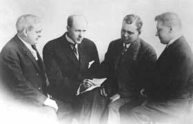 最初のロータリアン。左からシルベスター・シール、ポール・ハリス、ハイラム・ショーリー、ガスターバス・ローア。