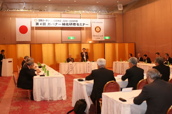 2008年5月24日(土)近江八幡市・ホテルニューオウミで第4回ガバナー補佐研修セミナーが、地区研修リーダー平井義久パストガバナー、川端五兵衞ガバナーエレクトはじめガバナー補佐全員、小林哲夫ガバナー事務所相談役の出席のもとに開催された。今回の主要な内容は、ガバナー公式訪問に関する諸課題で、活発で真摯な協議が行われた。「クラブ協議会」については、下記の事項を重点的に発表、協議を行いお願いすることになった。