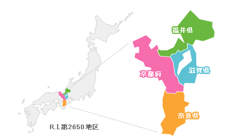 国際ロータリー2650地区は、京都、奈良、福井、滋賀、4県にある96クラブ、総会員5,150名で構成されています。(2007年4月末)いずれも歴史的に、古い都のあった伝統のある地域や、遠い昔、中国と交流のあった日本海側の地域という、我国でも大変興味深い歴史と伝統を誇っています。又、我国最大の湖、琵琶湖を有し、地球環境問題にも積極的に貢献しています。